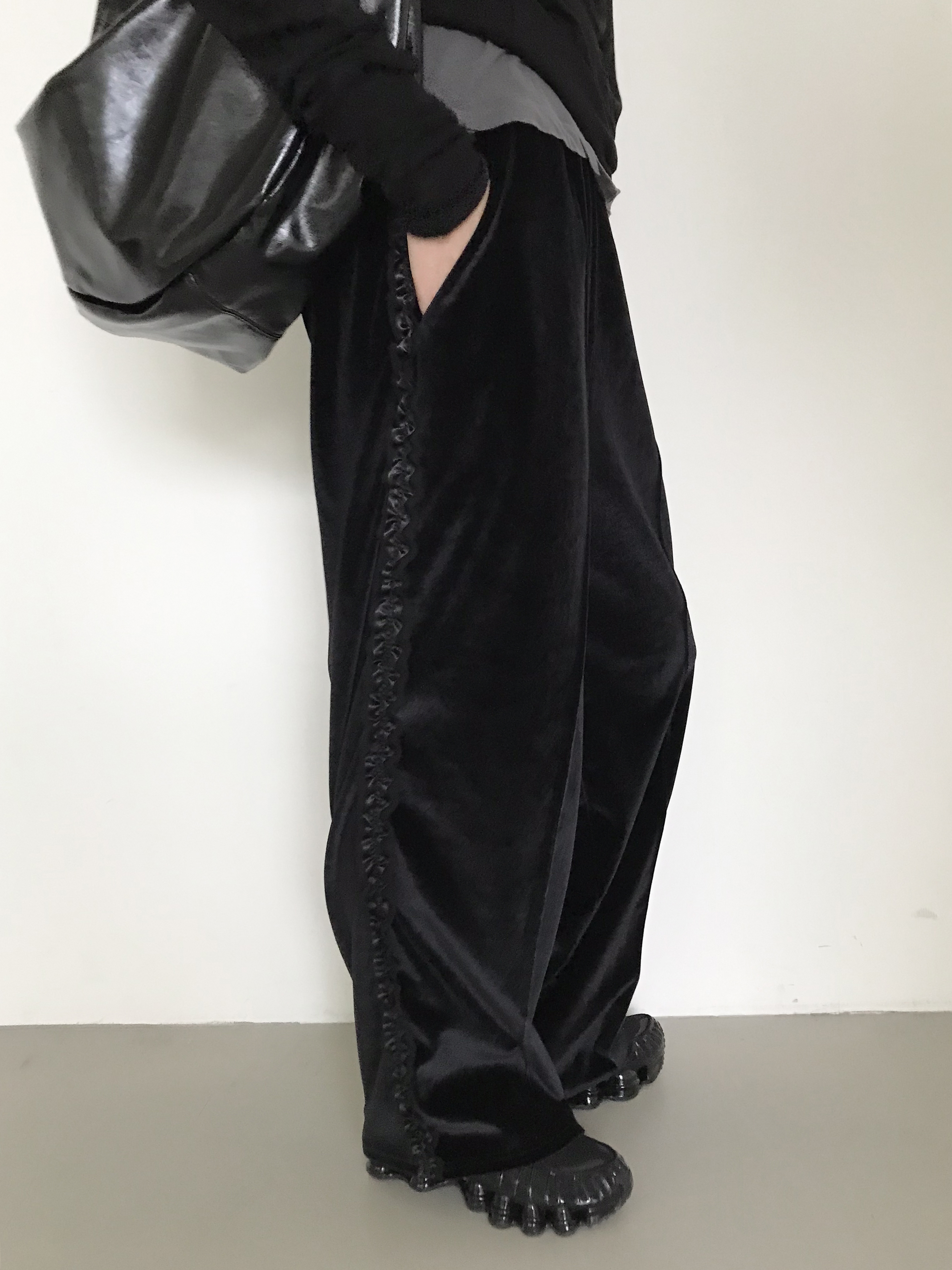 무심히 세련된 무드. 벨벳 소재의 트랙 팬츠
