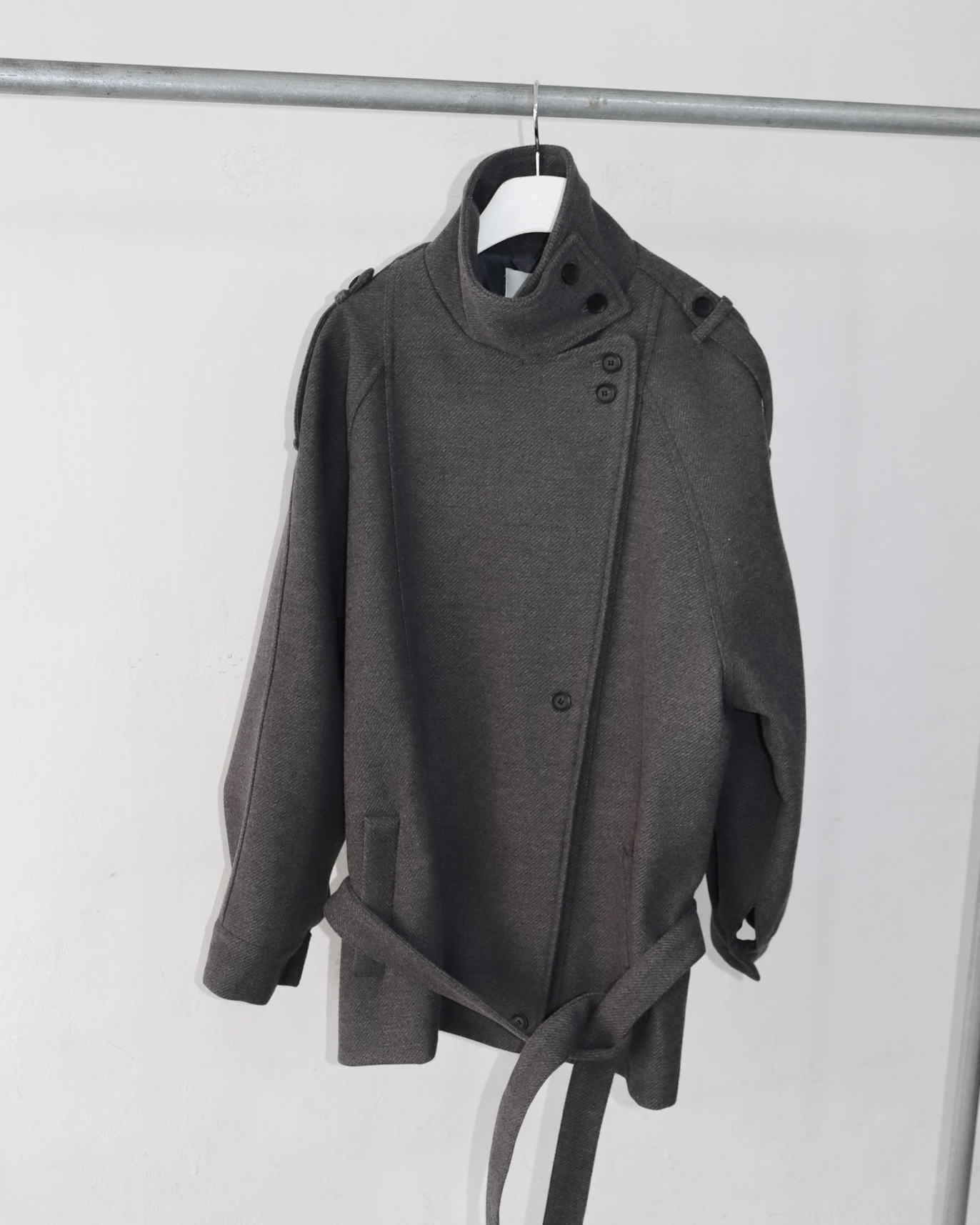 엉뚱하고 위트있는 벨트 디테일의 하이넥 하프 코트