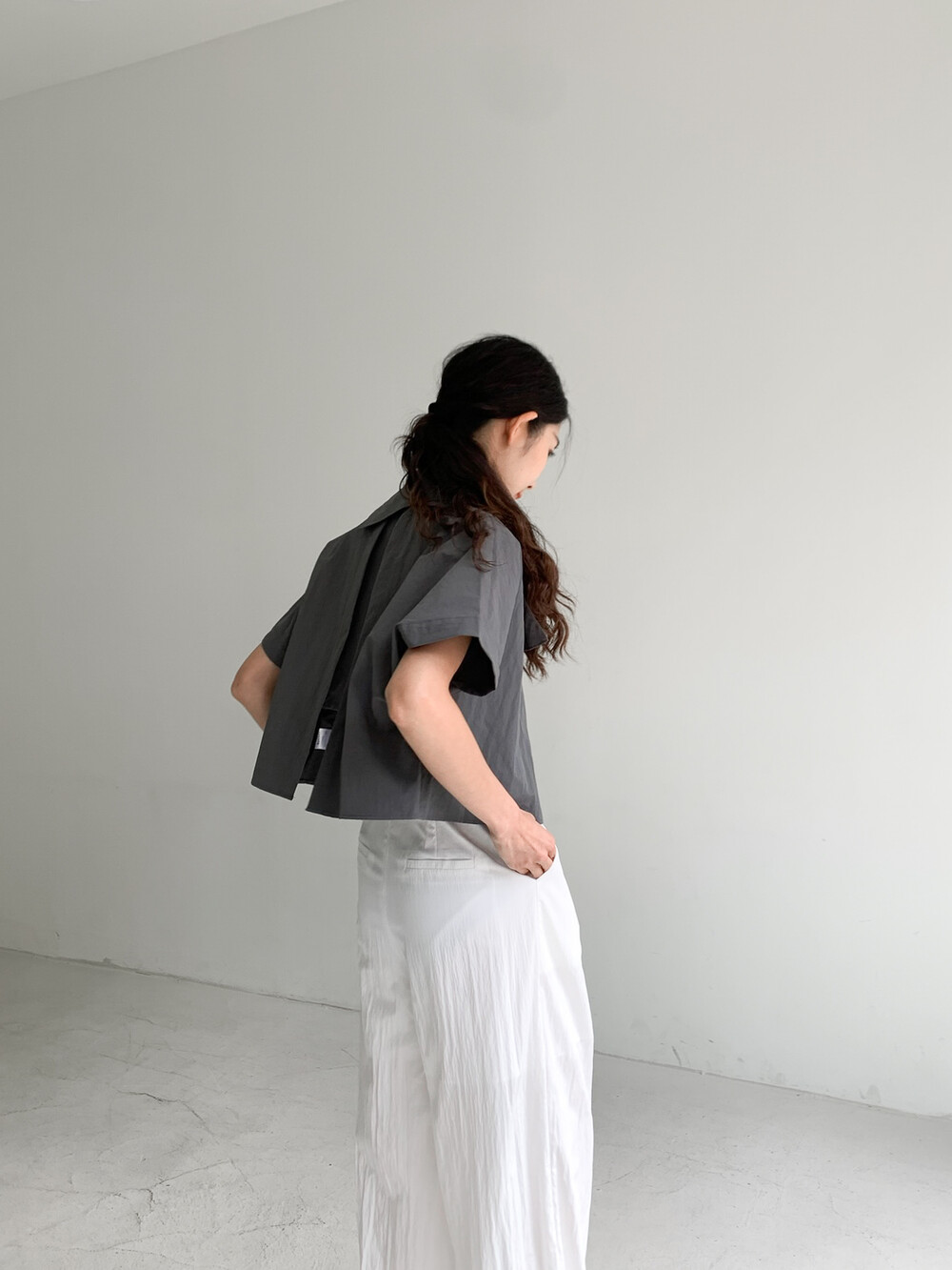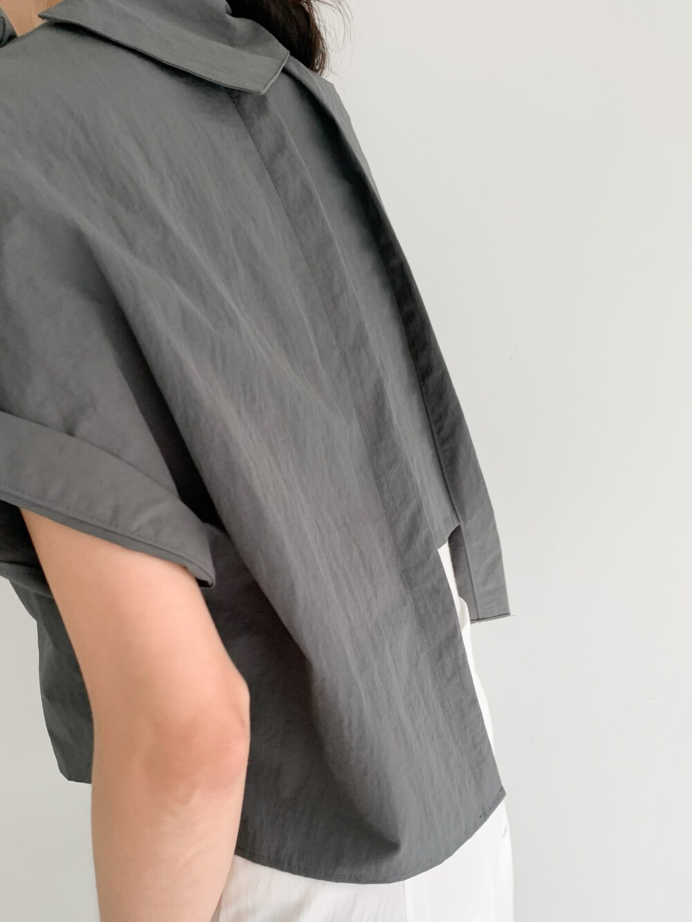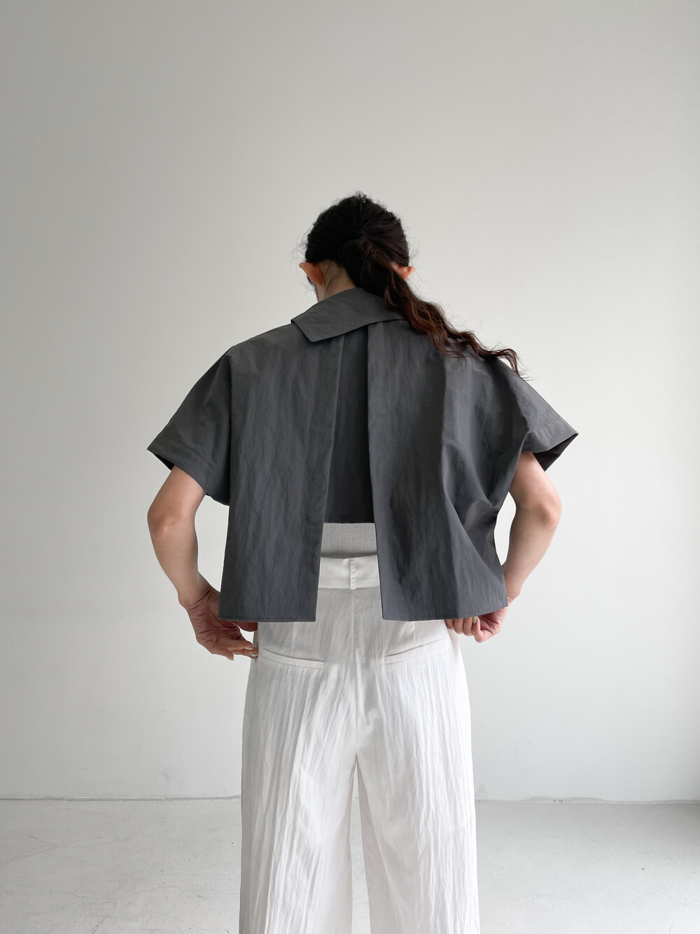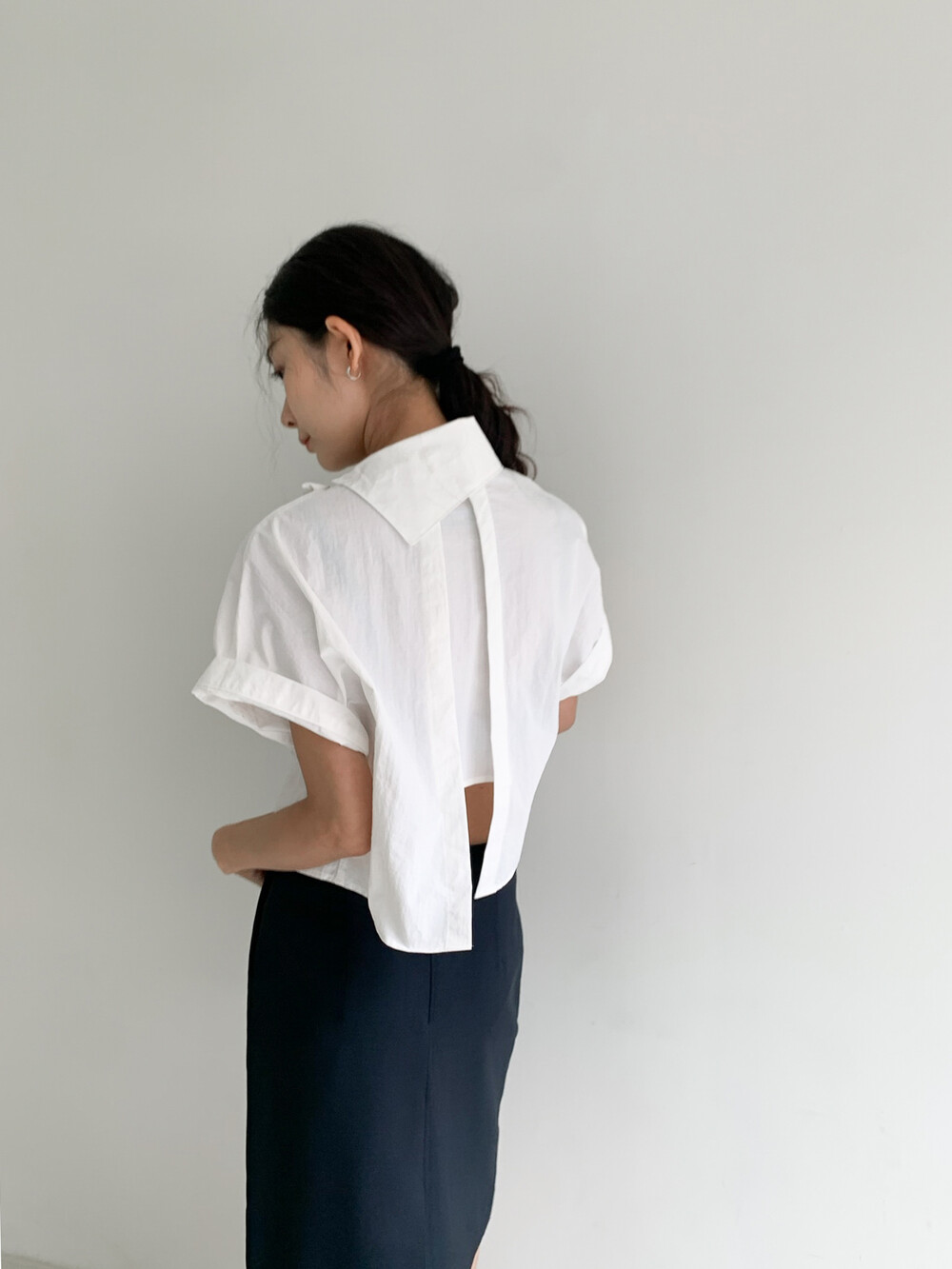 적당한 크롭 기장감/ 백라인 트임 디테일이 허리 라인을