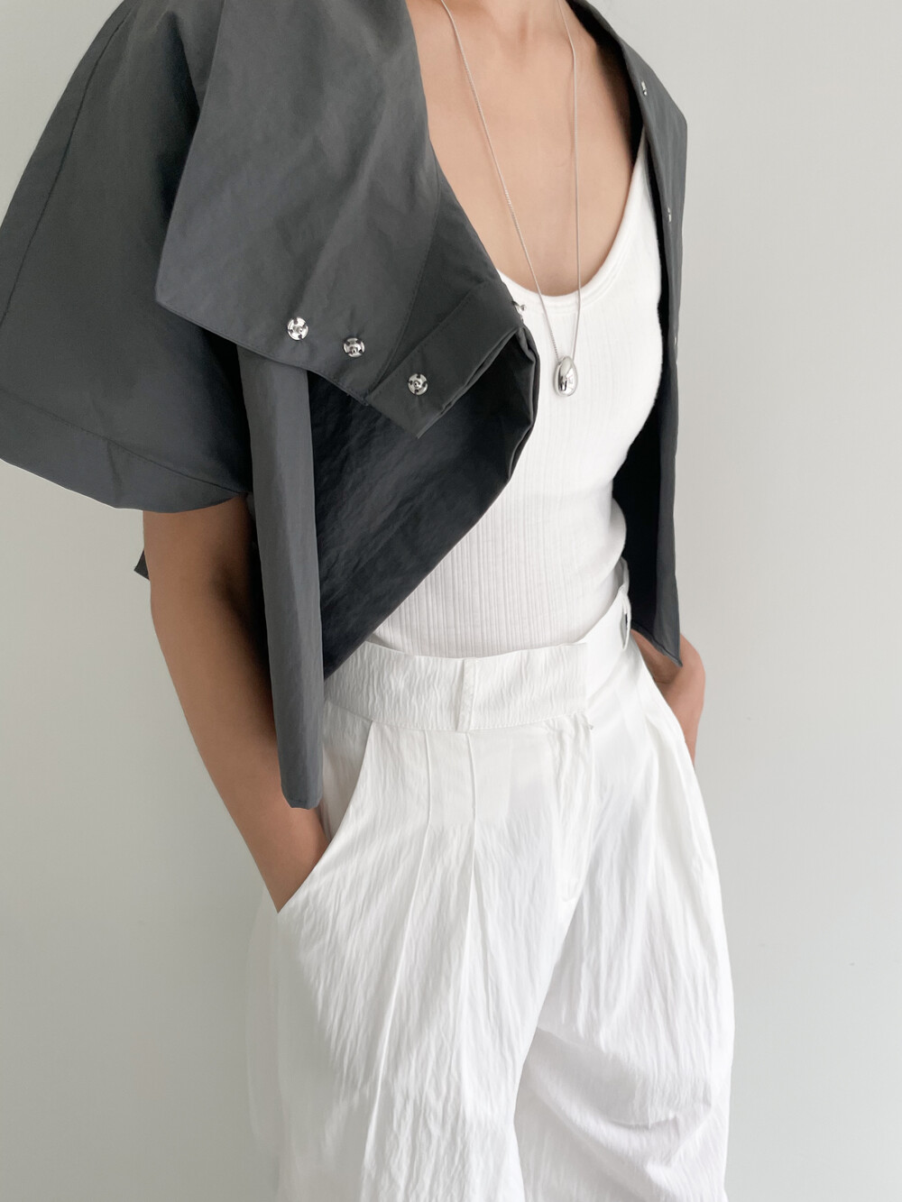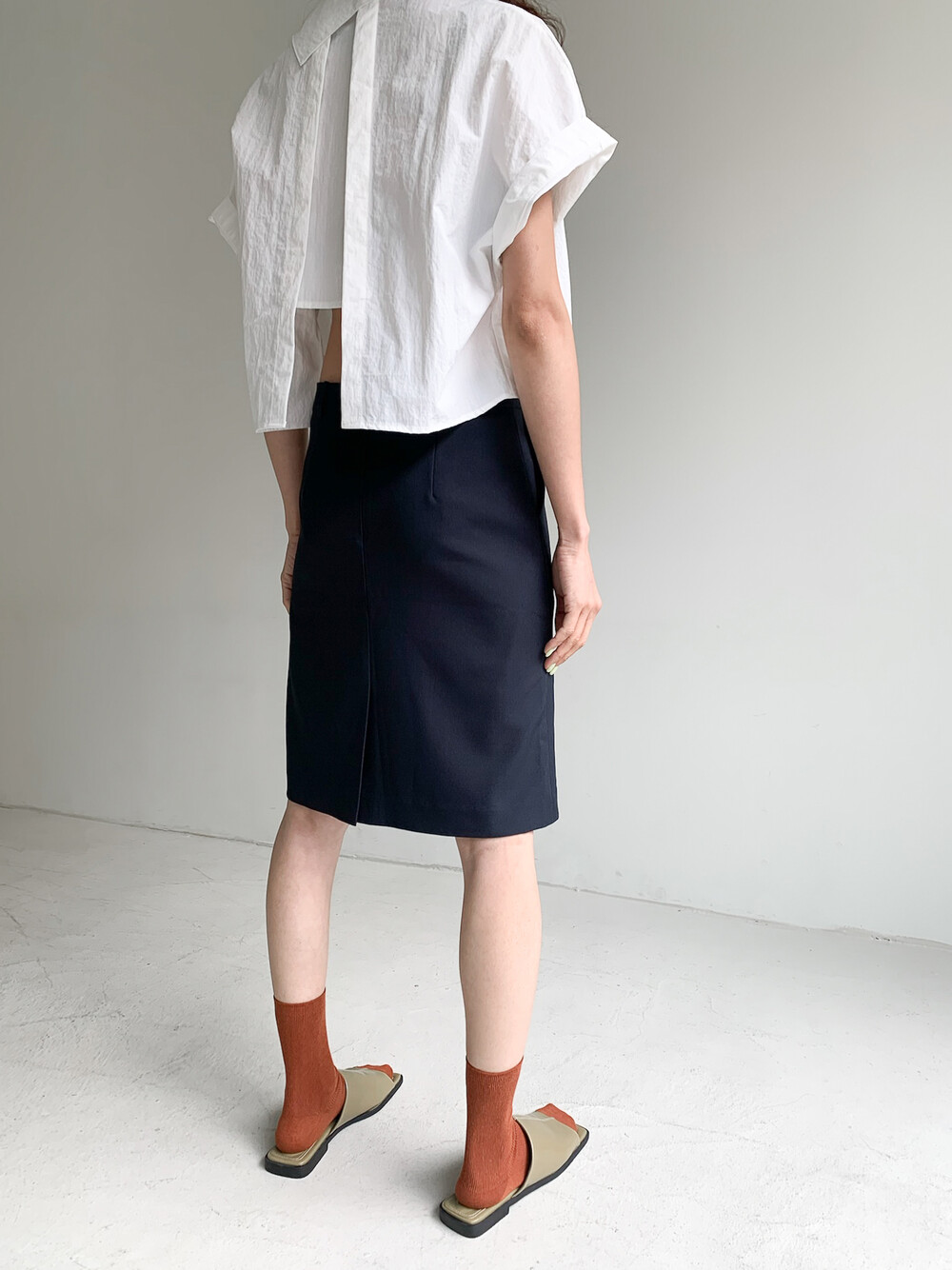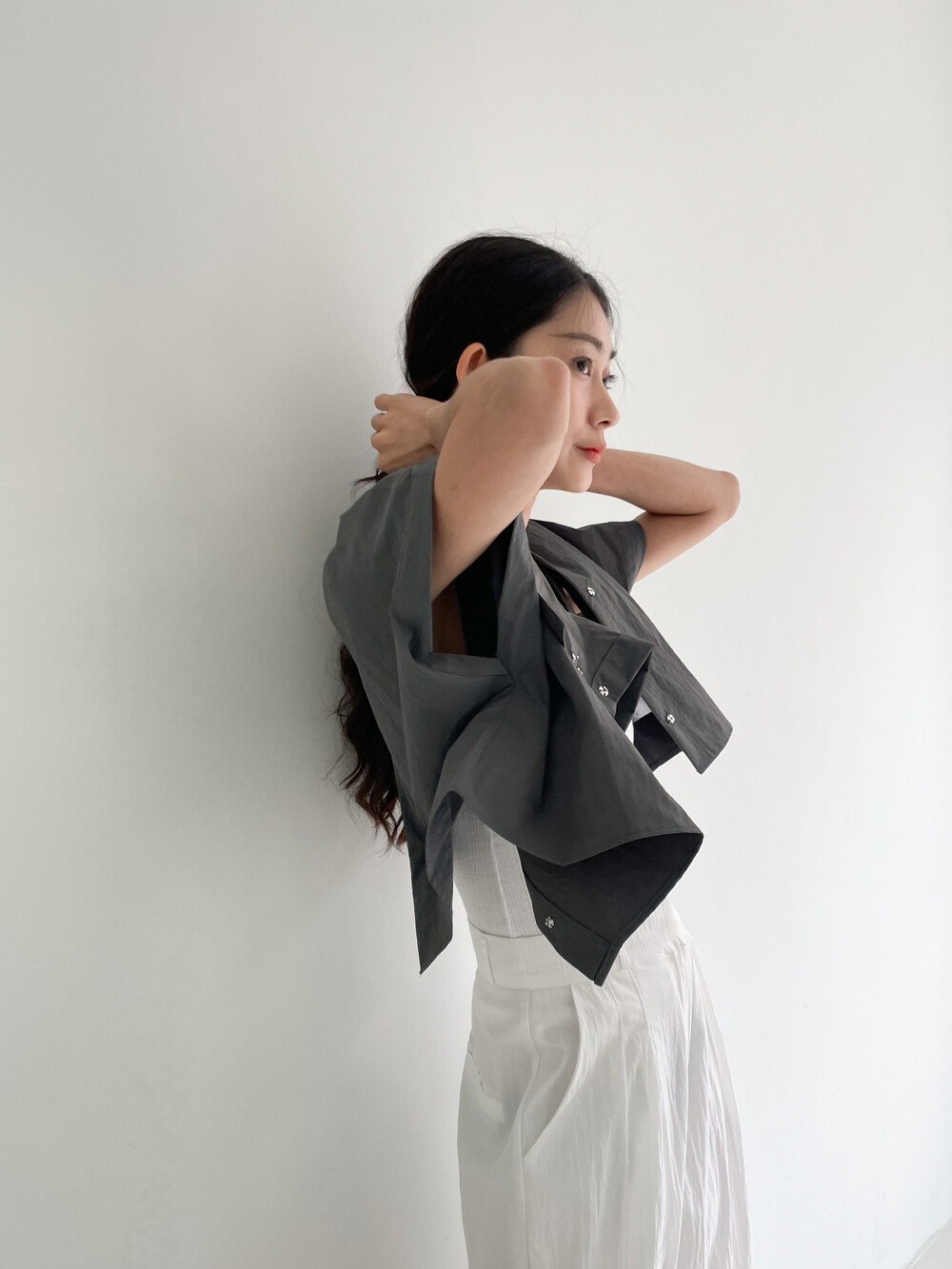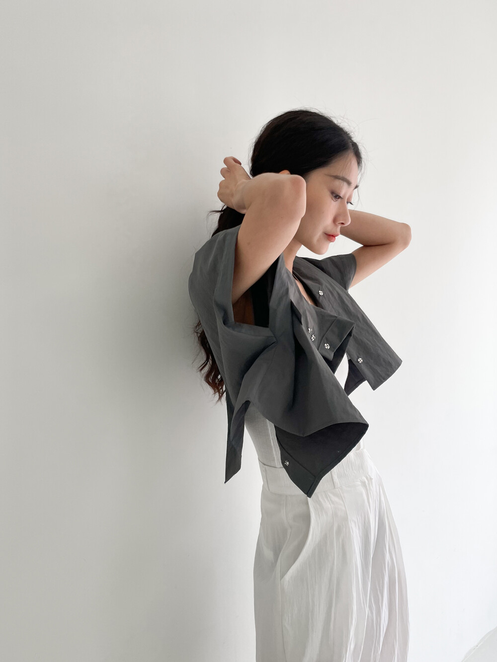 적당한 크롭 기장감/ 백라인 트임 디테일이 허리 라인을