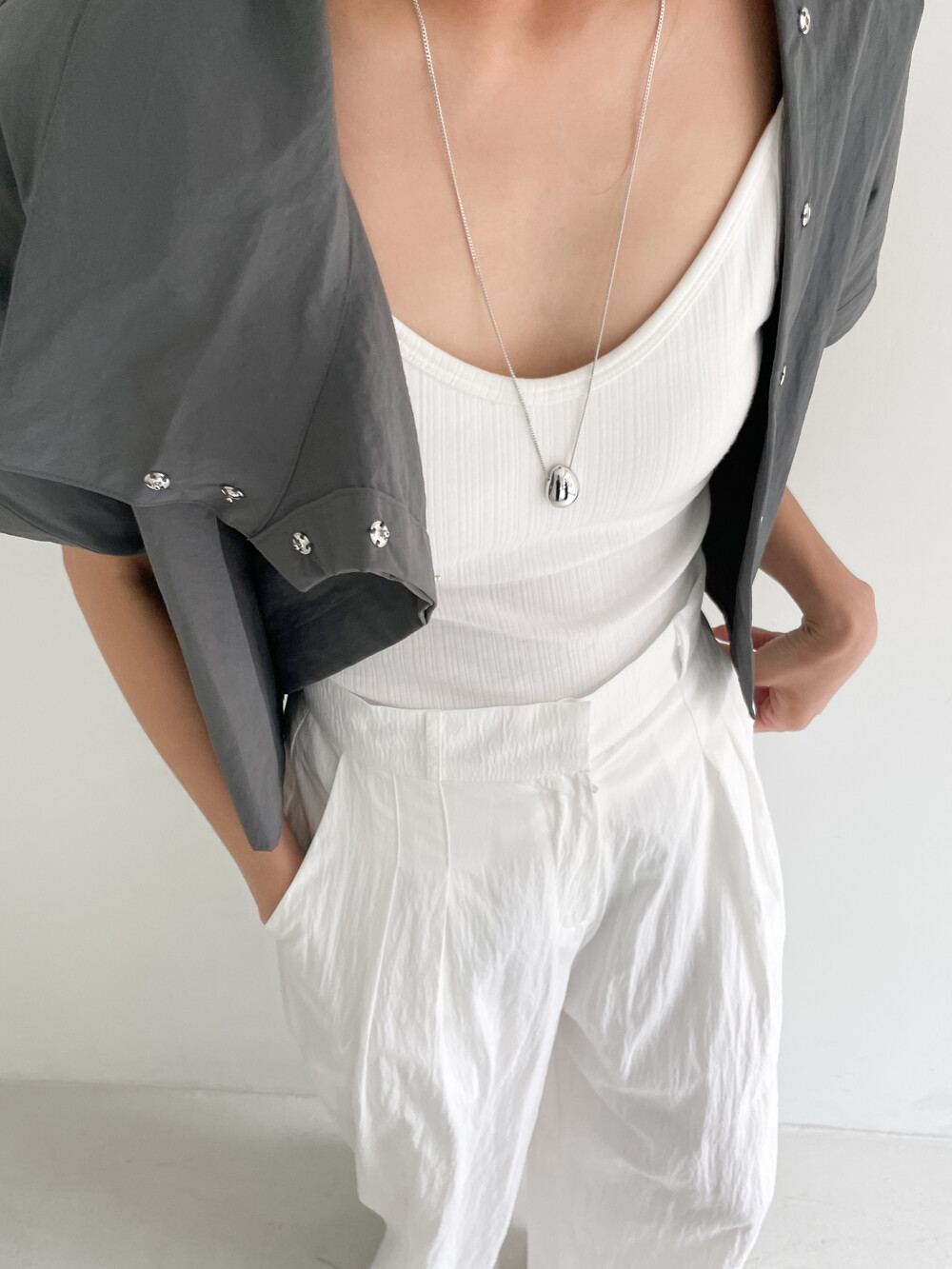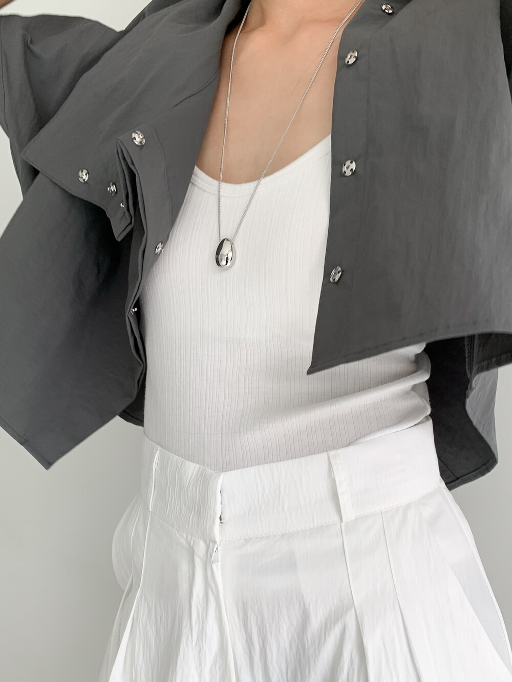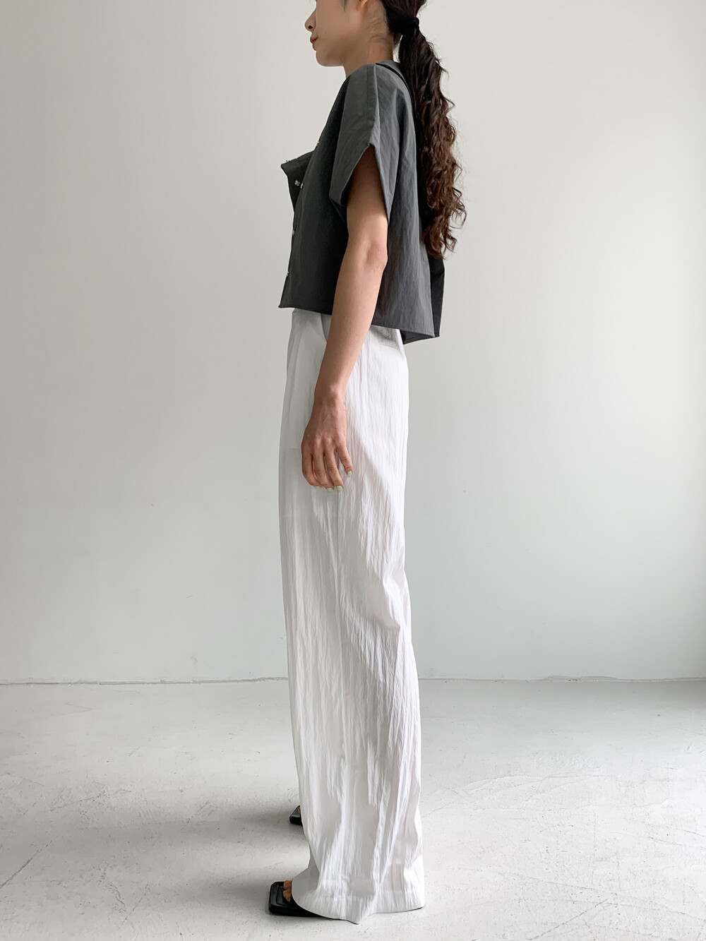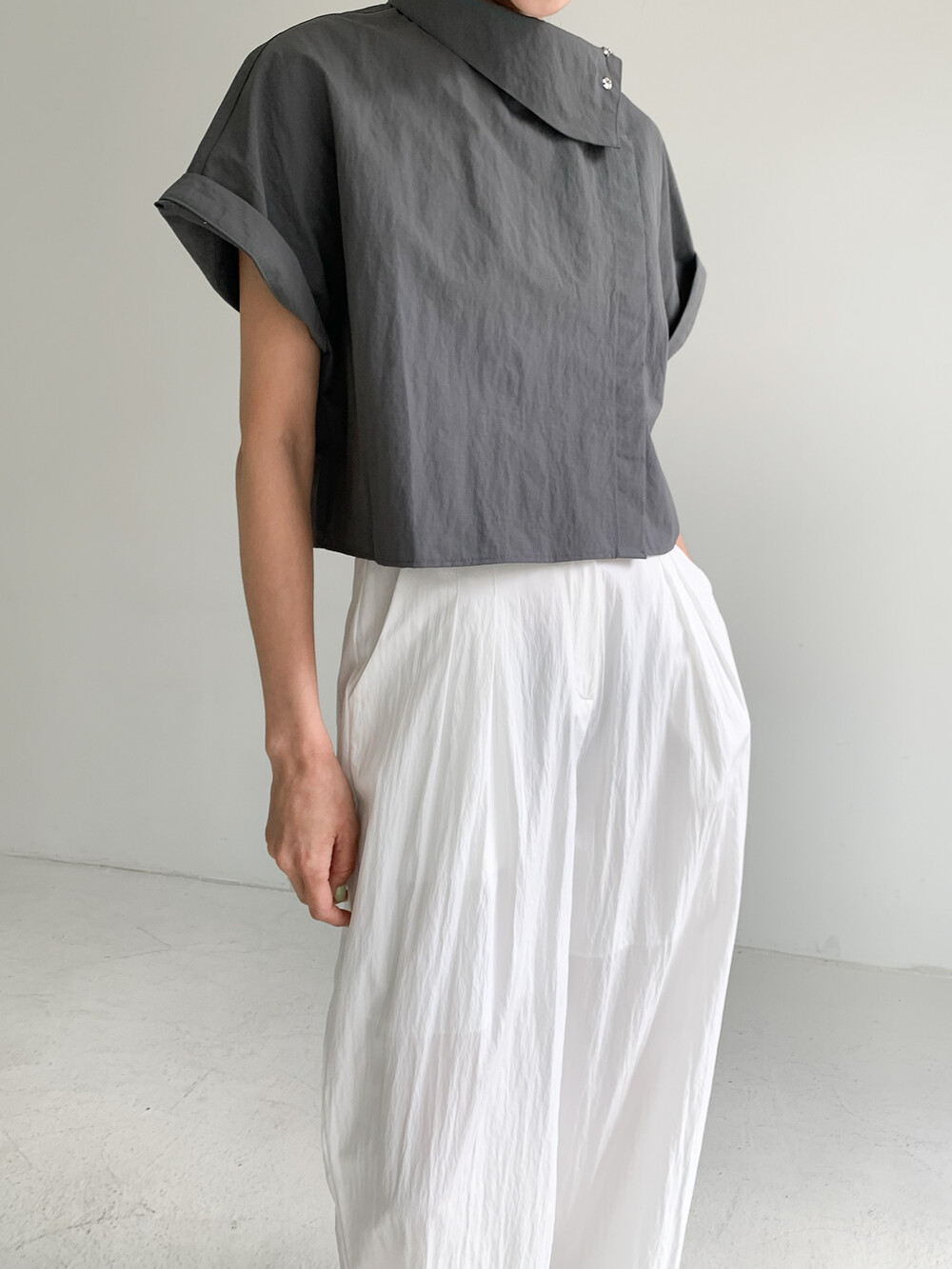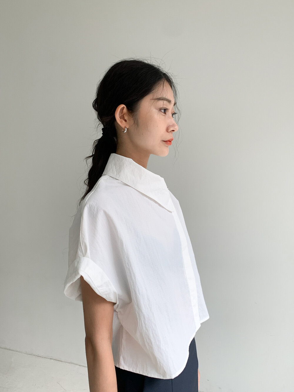 적당한 크롭 기장감/ 백라인 트임 디테일이 허리 라인을