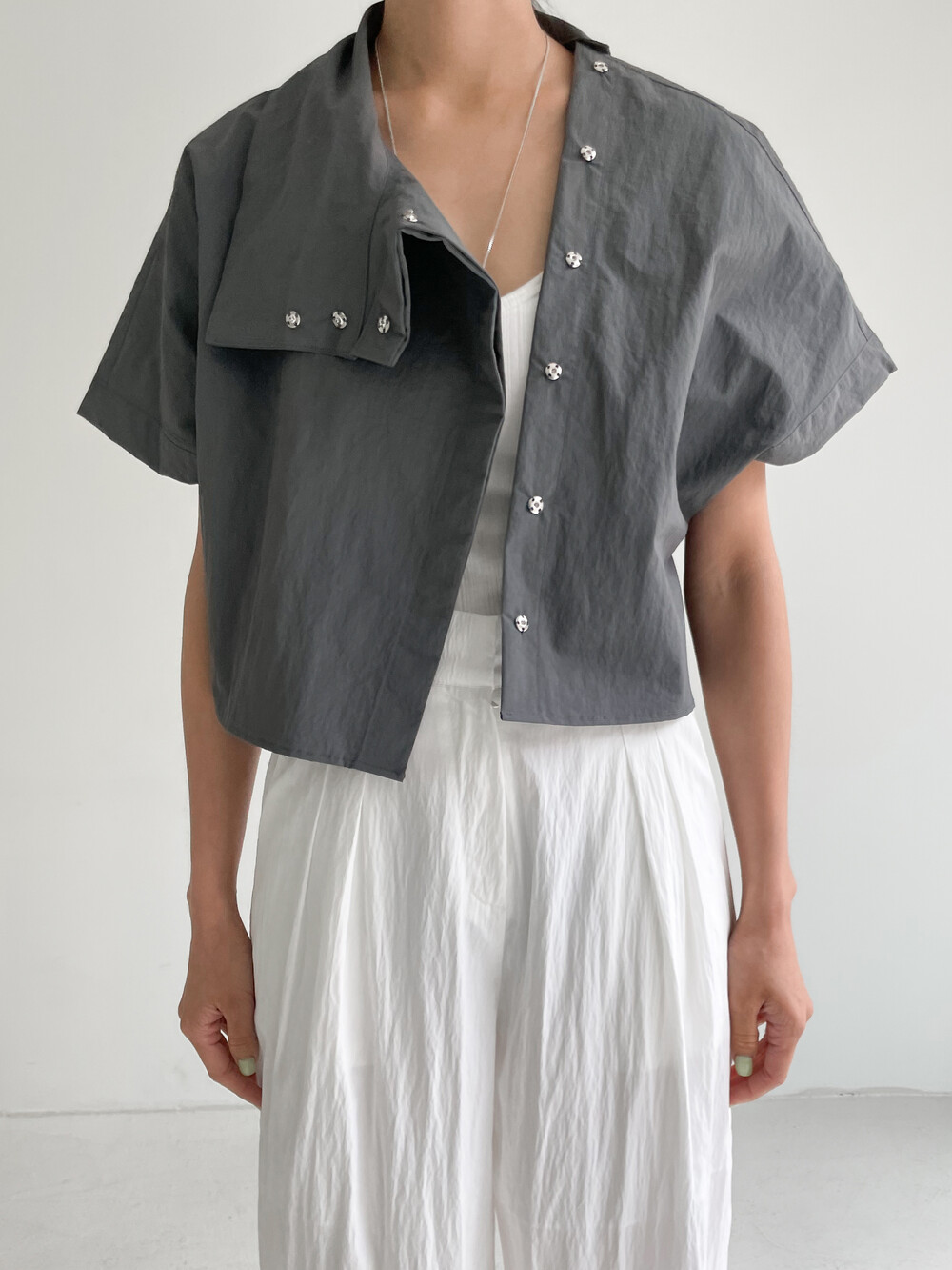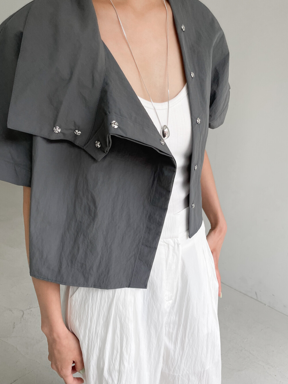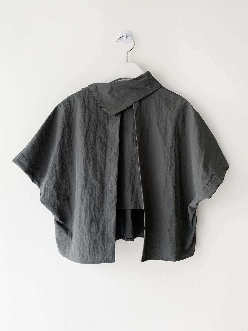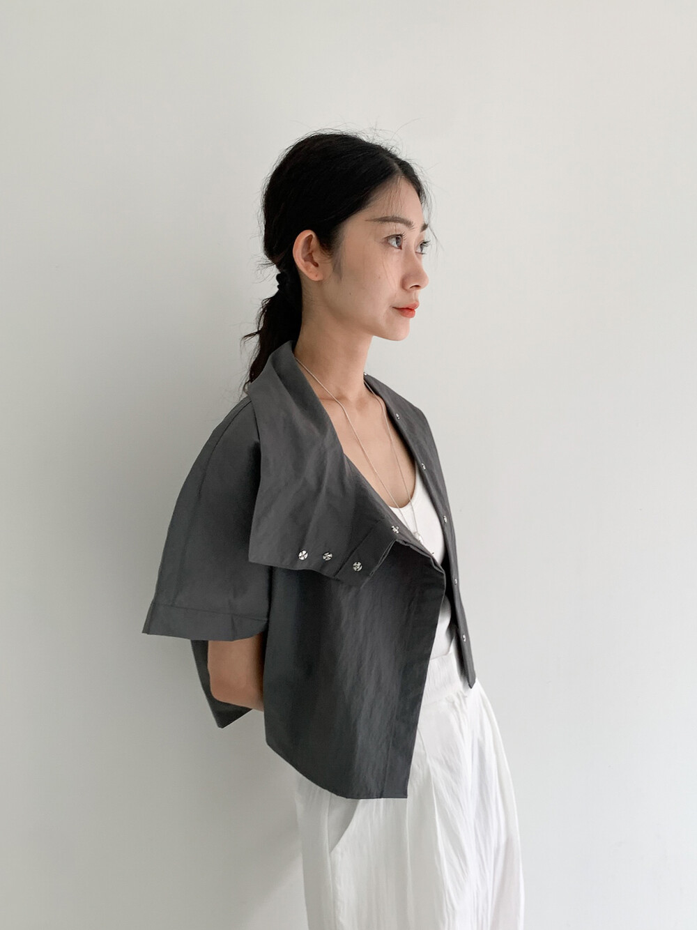 적당한 크롭 기장감/ 백라인 트임 디테일이 허리 라인을