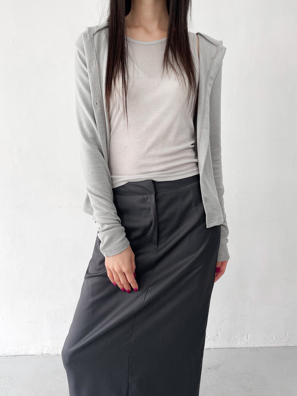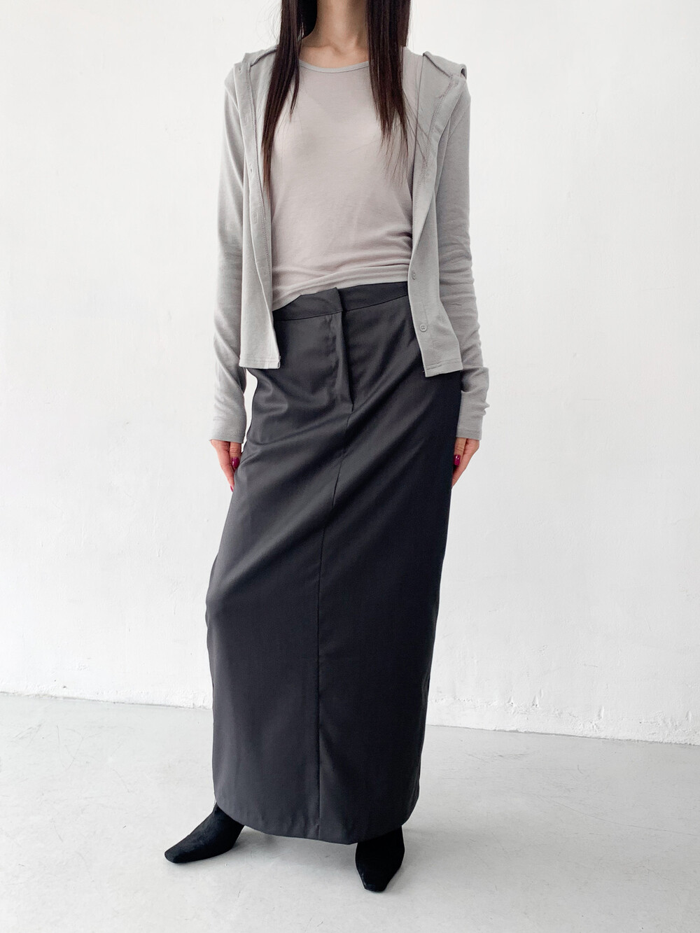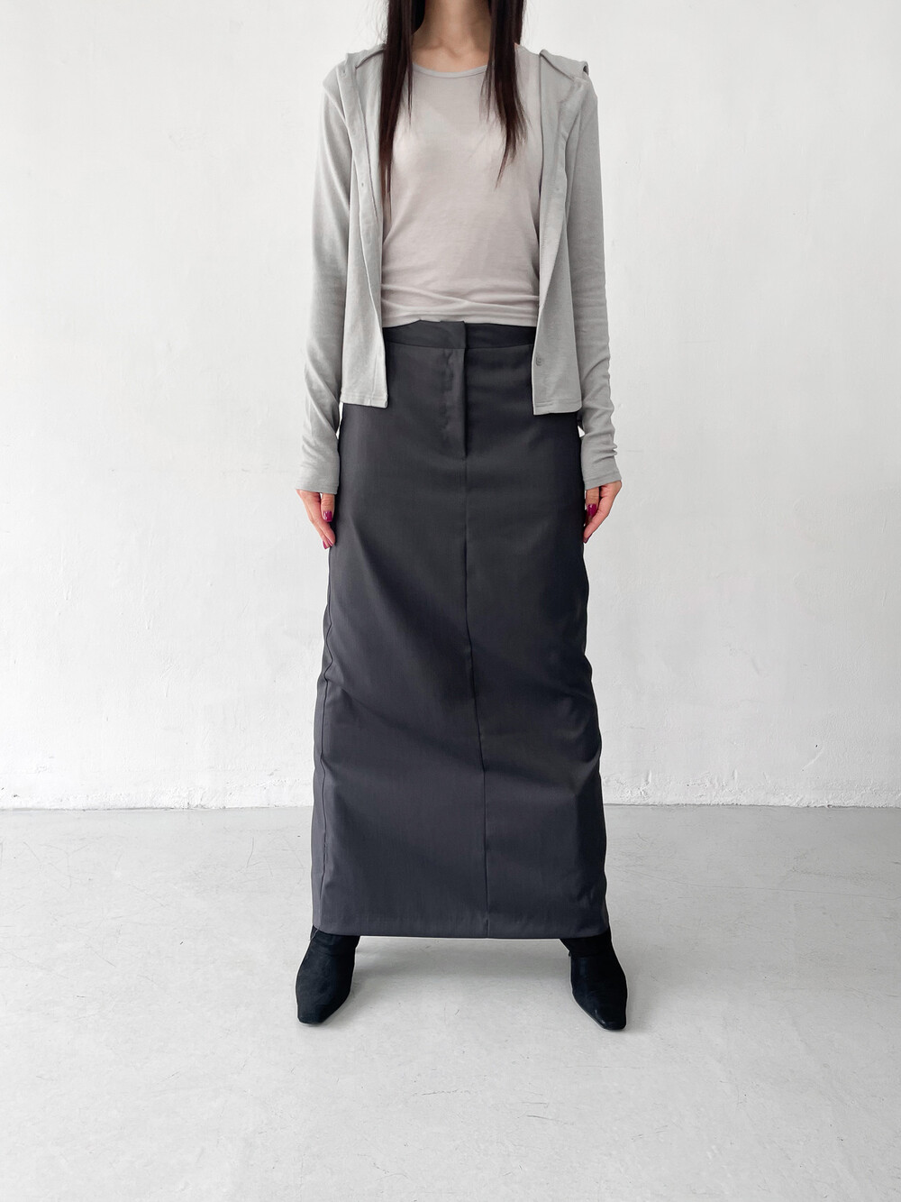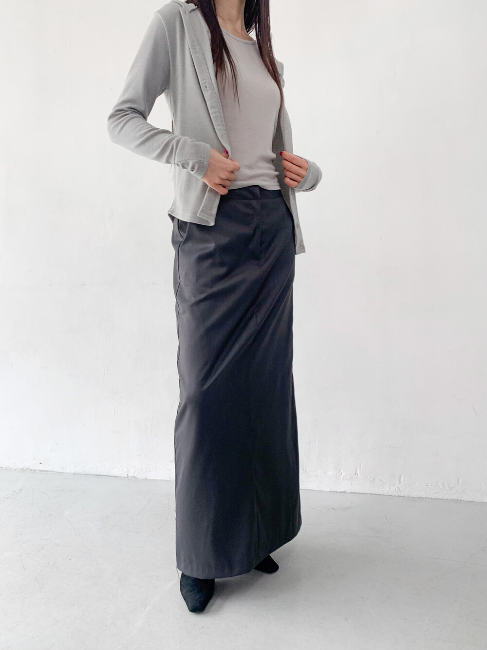 맥시한 기장감과 약간의 광택감이 도는 원단,