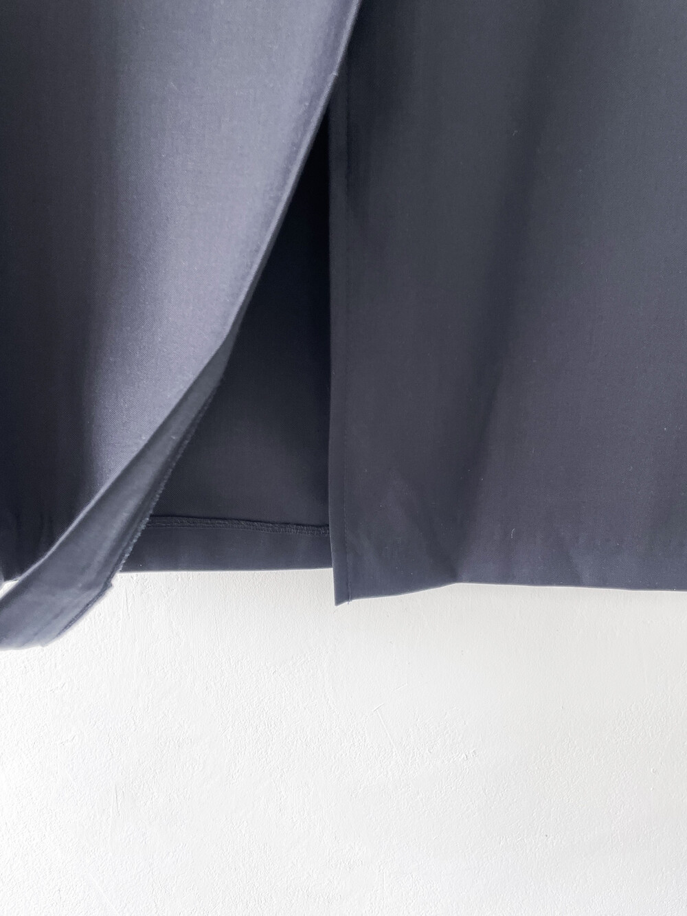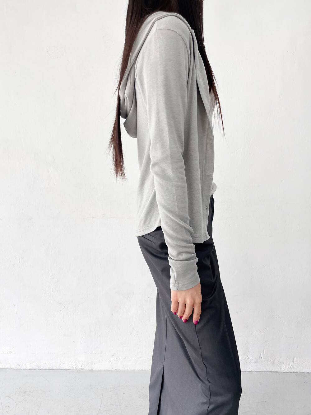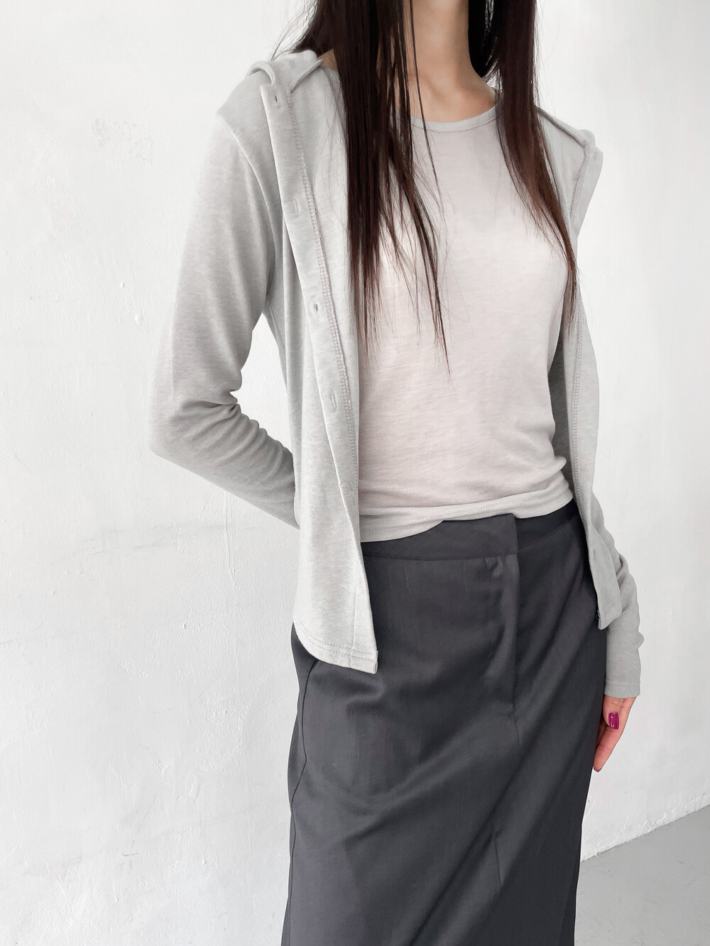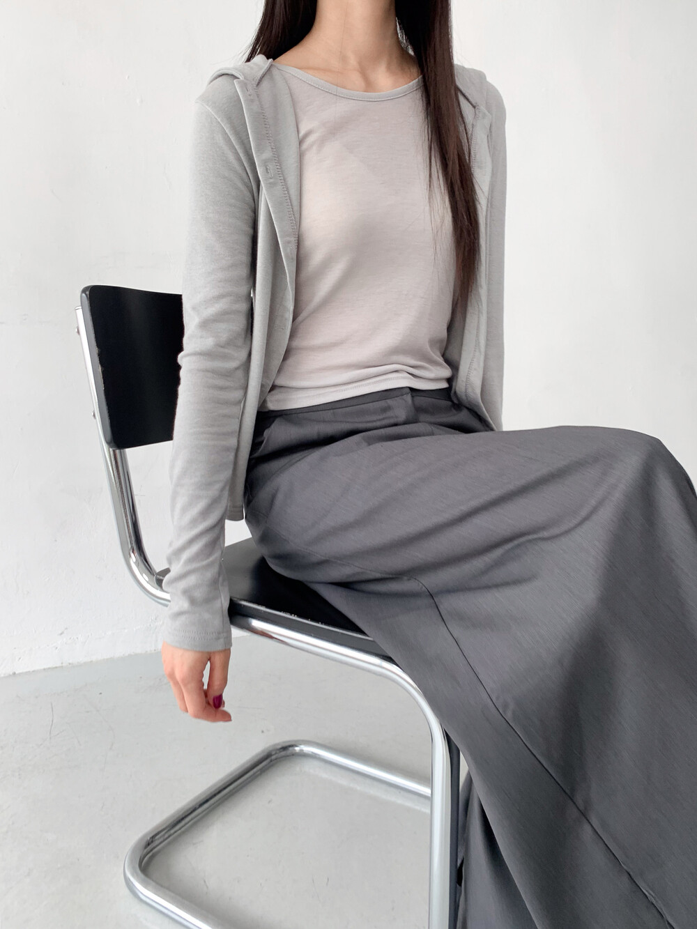 맥시한 기장감과 약간의 광택감이 도는 원단,