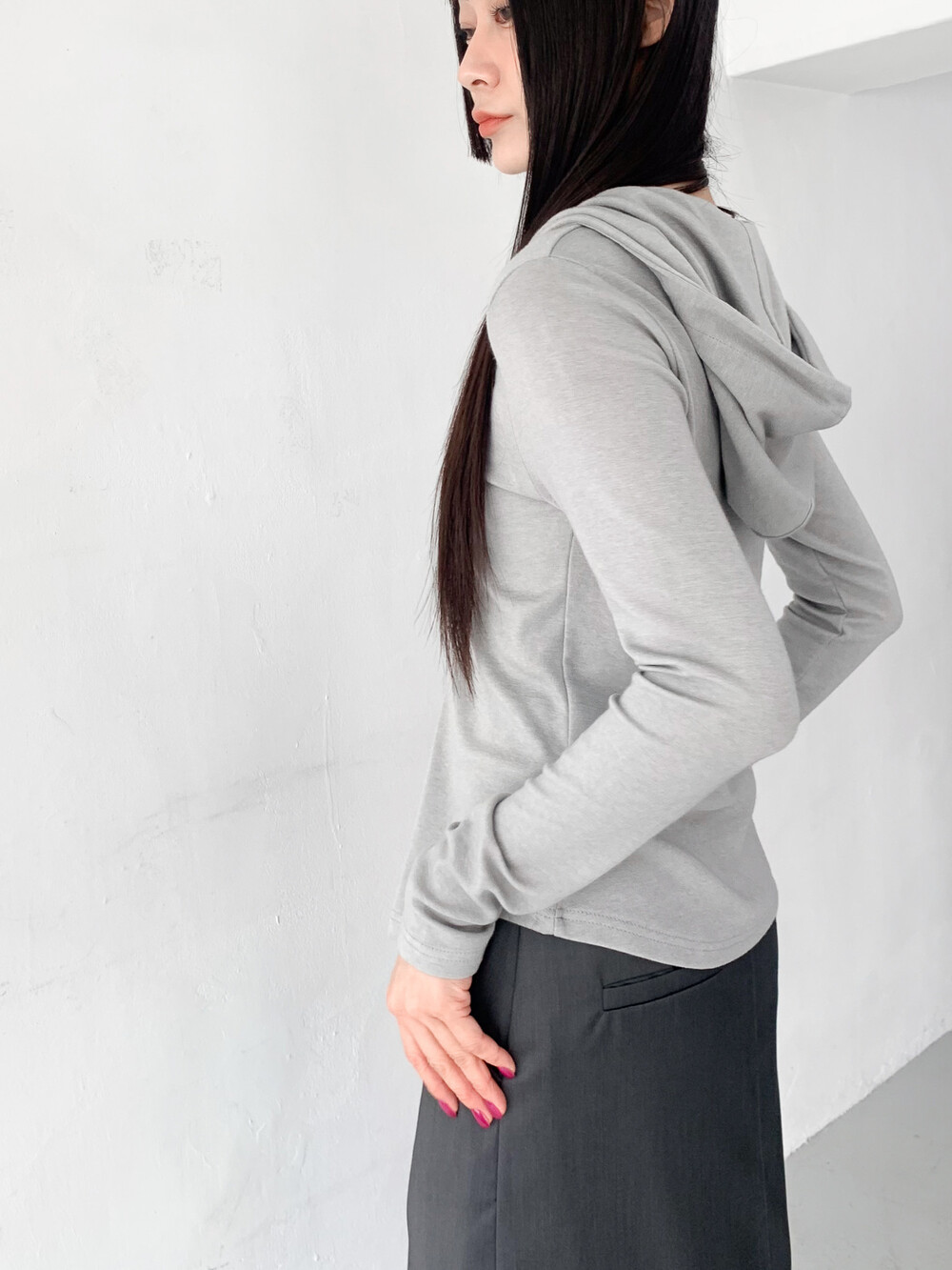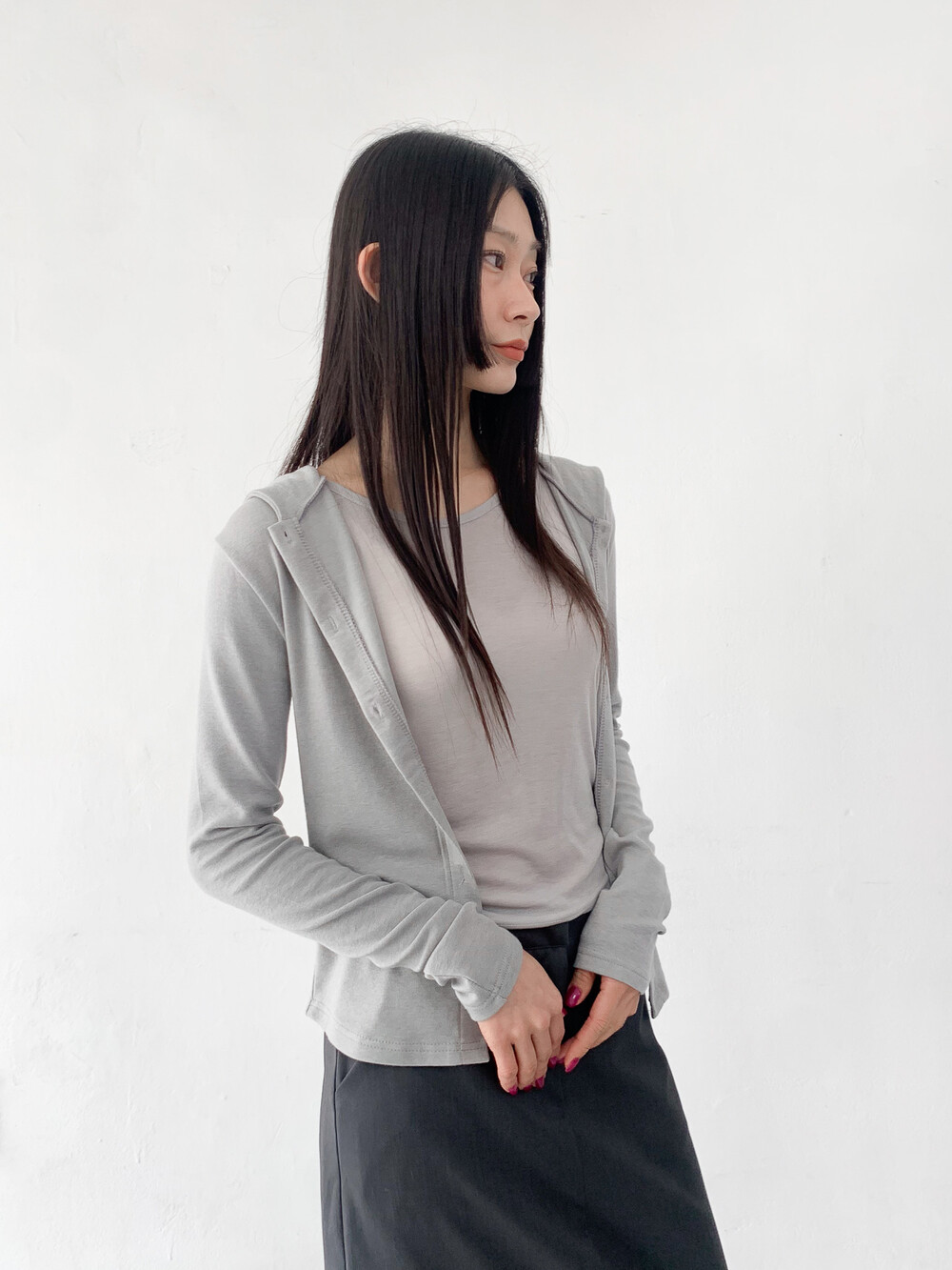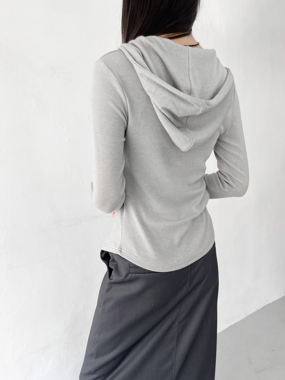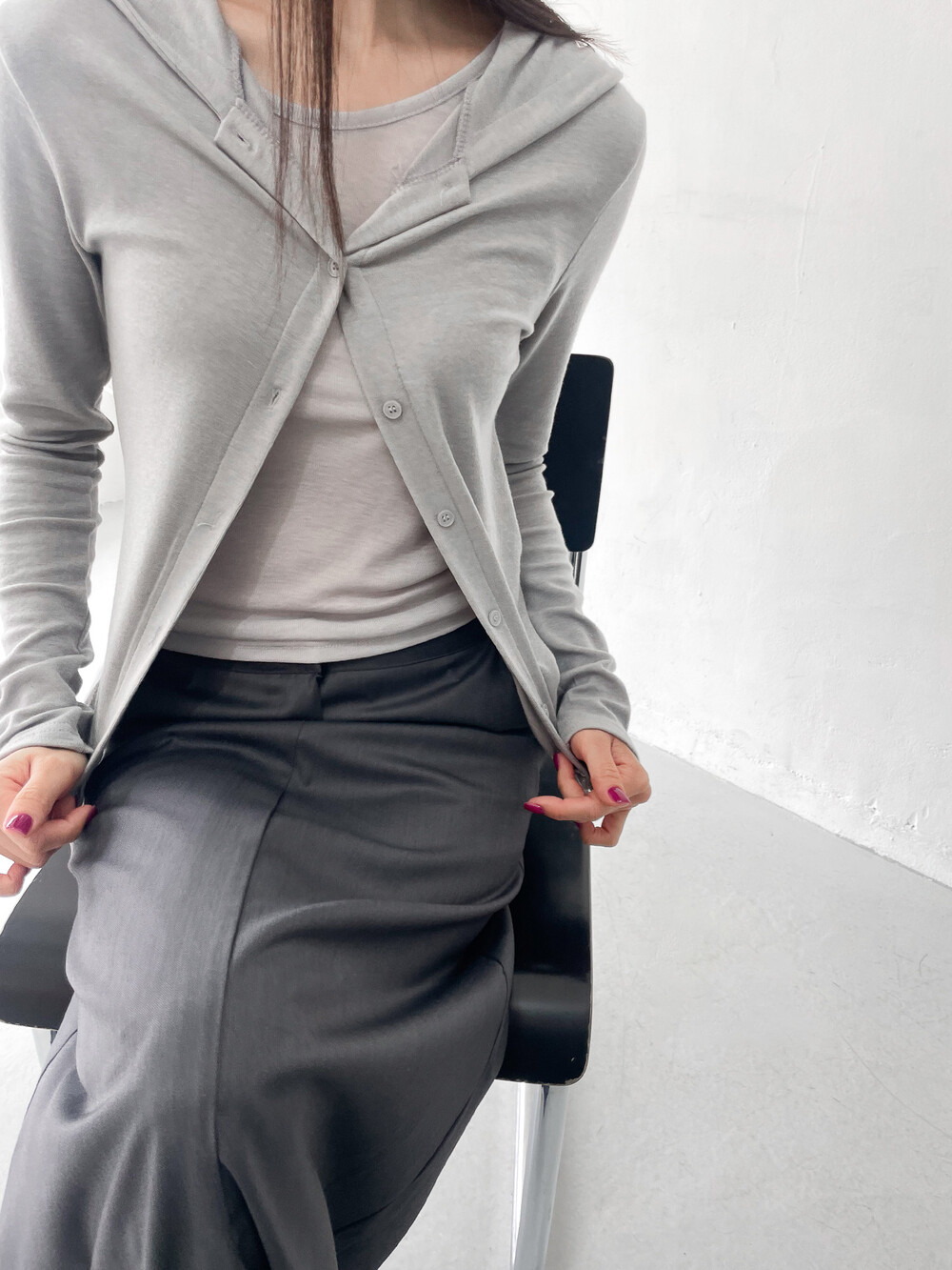 맥시한 기장감과 약간의 광택감이 도는 원단,
