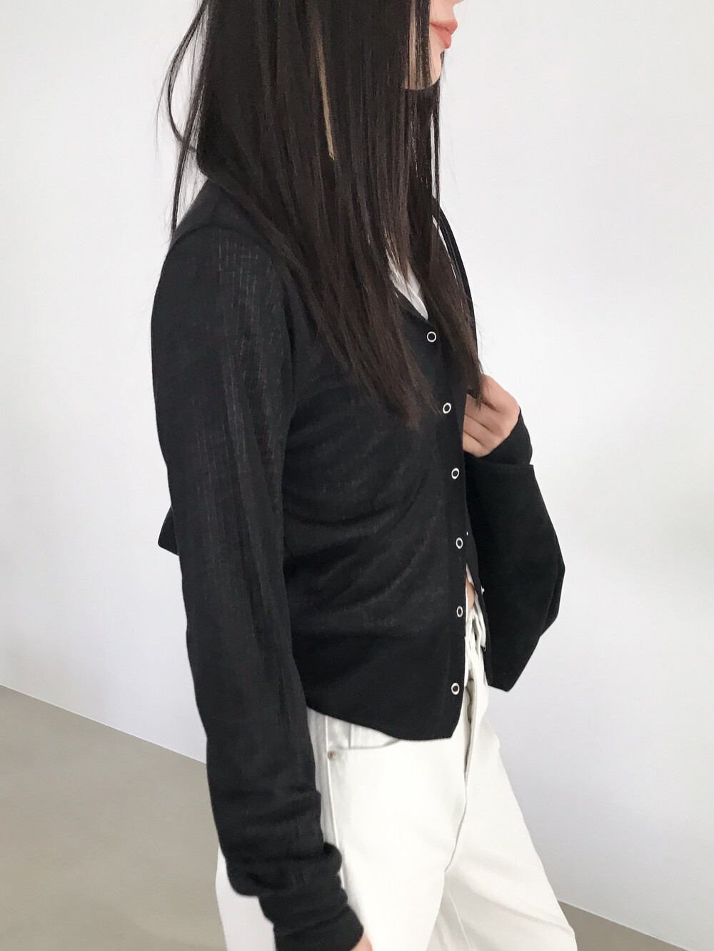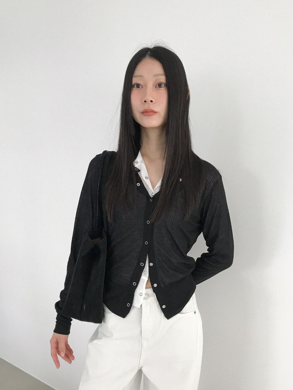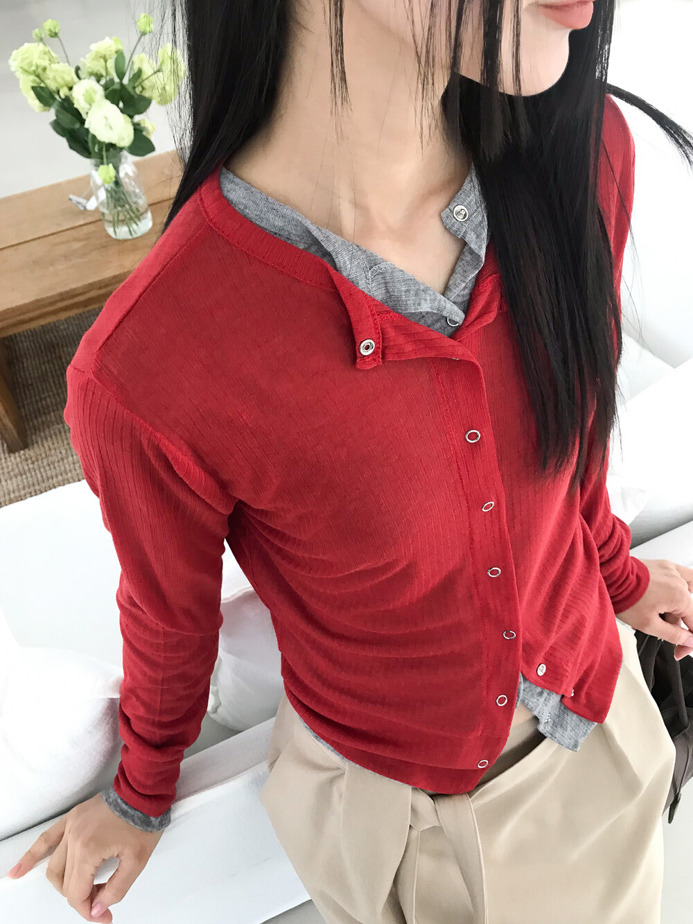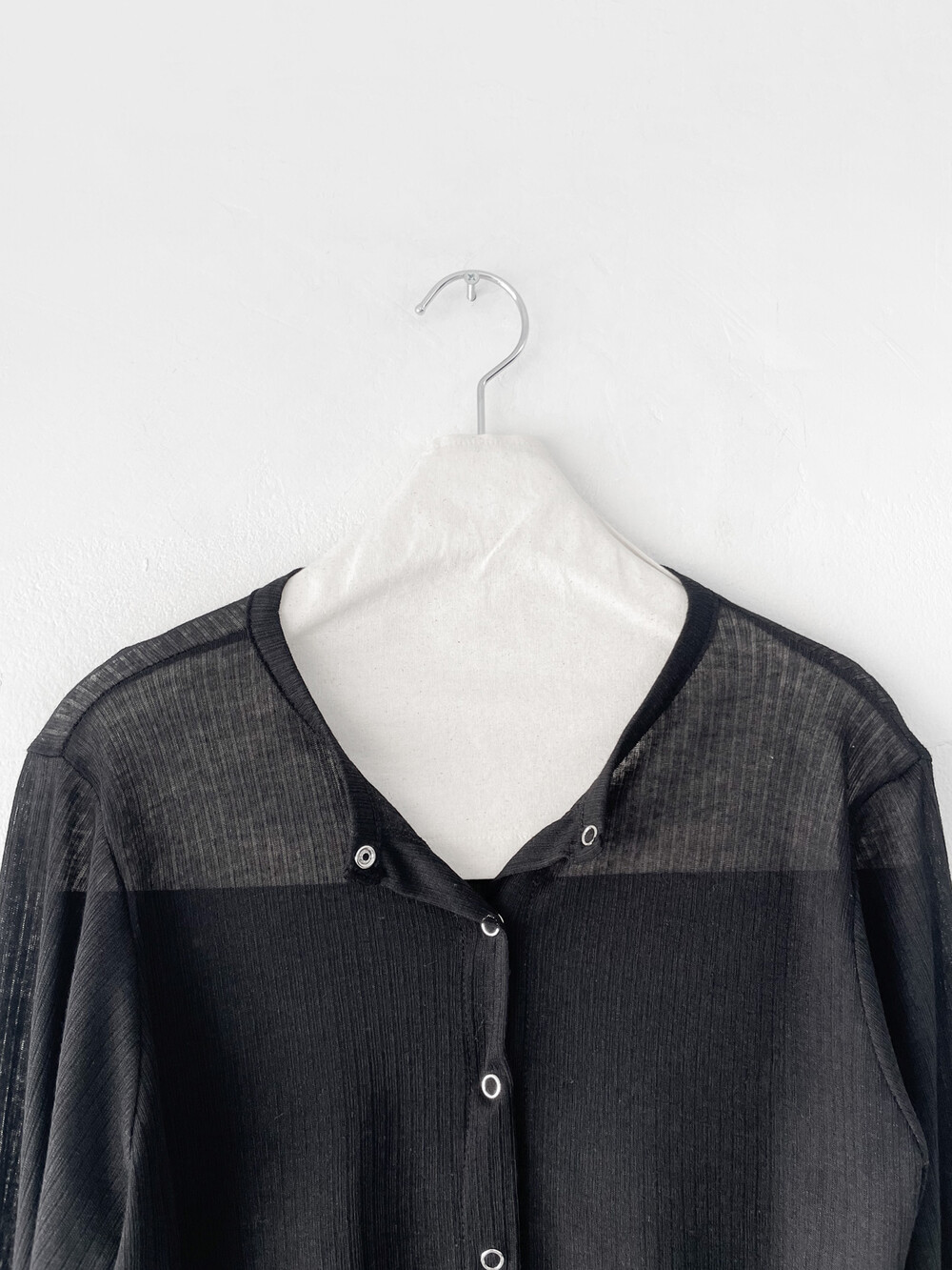 얇은 소재감으로 이너의 컬러감이 약간 희끗하게 비쳐