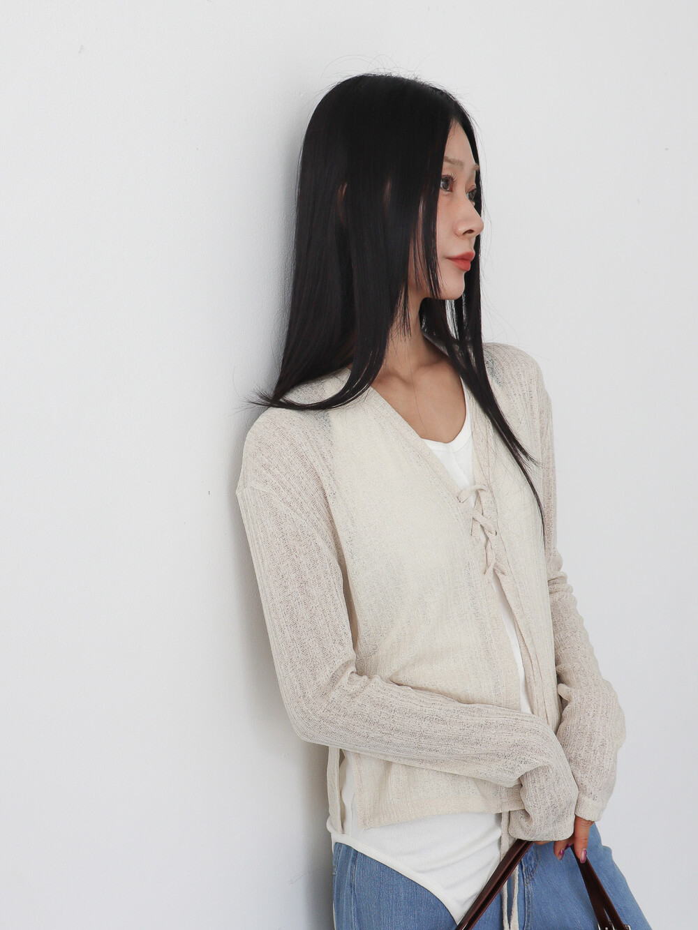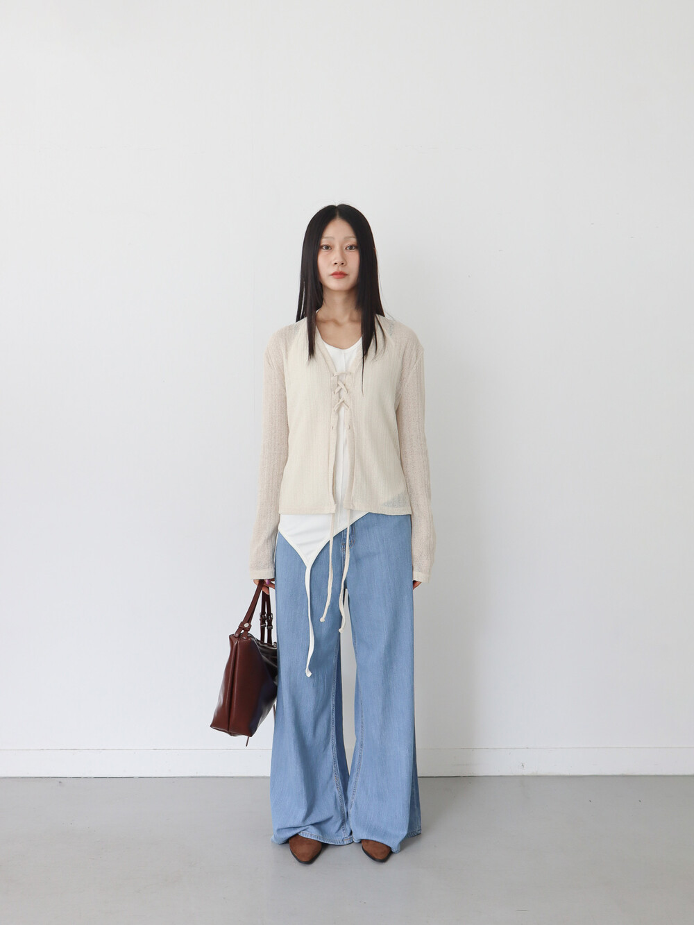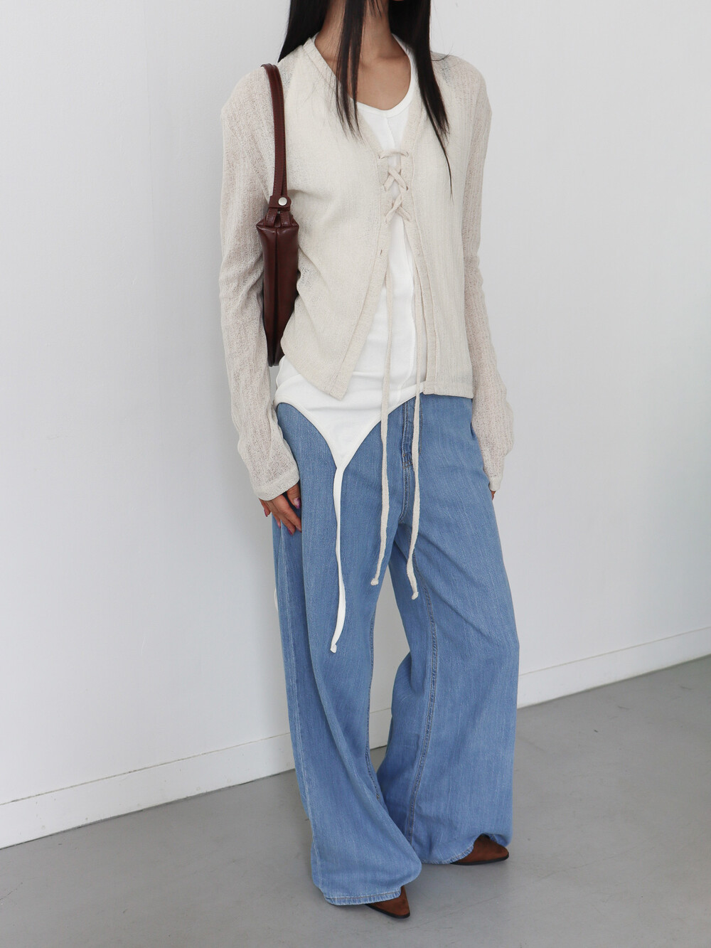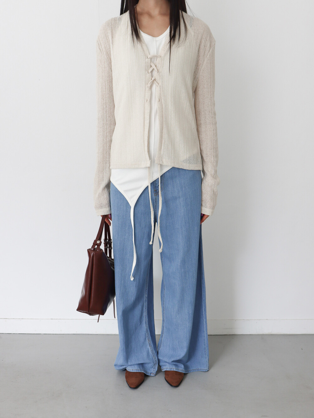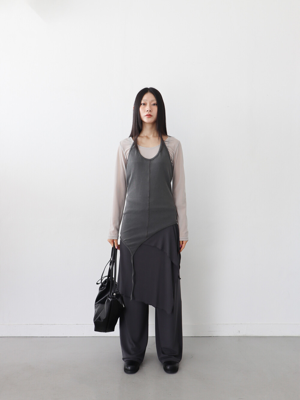 끈을 홀터로 묶어 착용하는 방식의 내추럴한 분위기의 탑