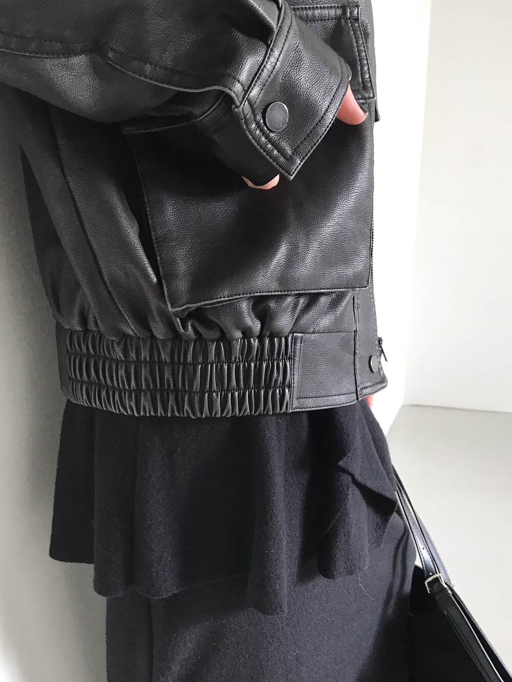 전면의 제 원단이 여러 겹 레이어링이 된 디테일 자체가