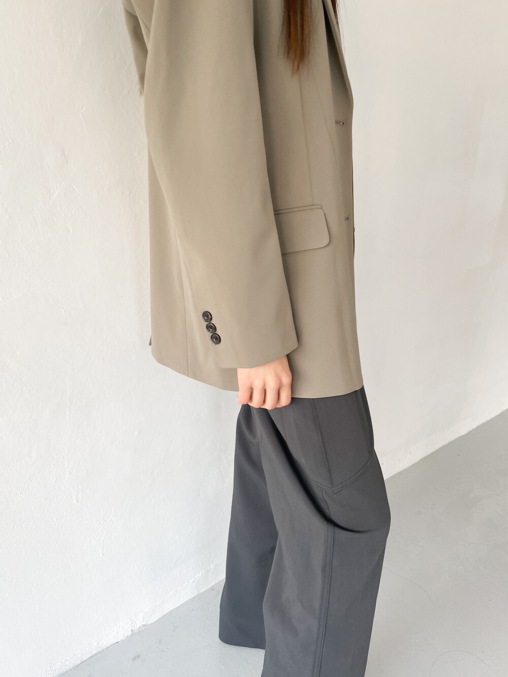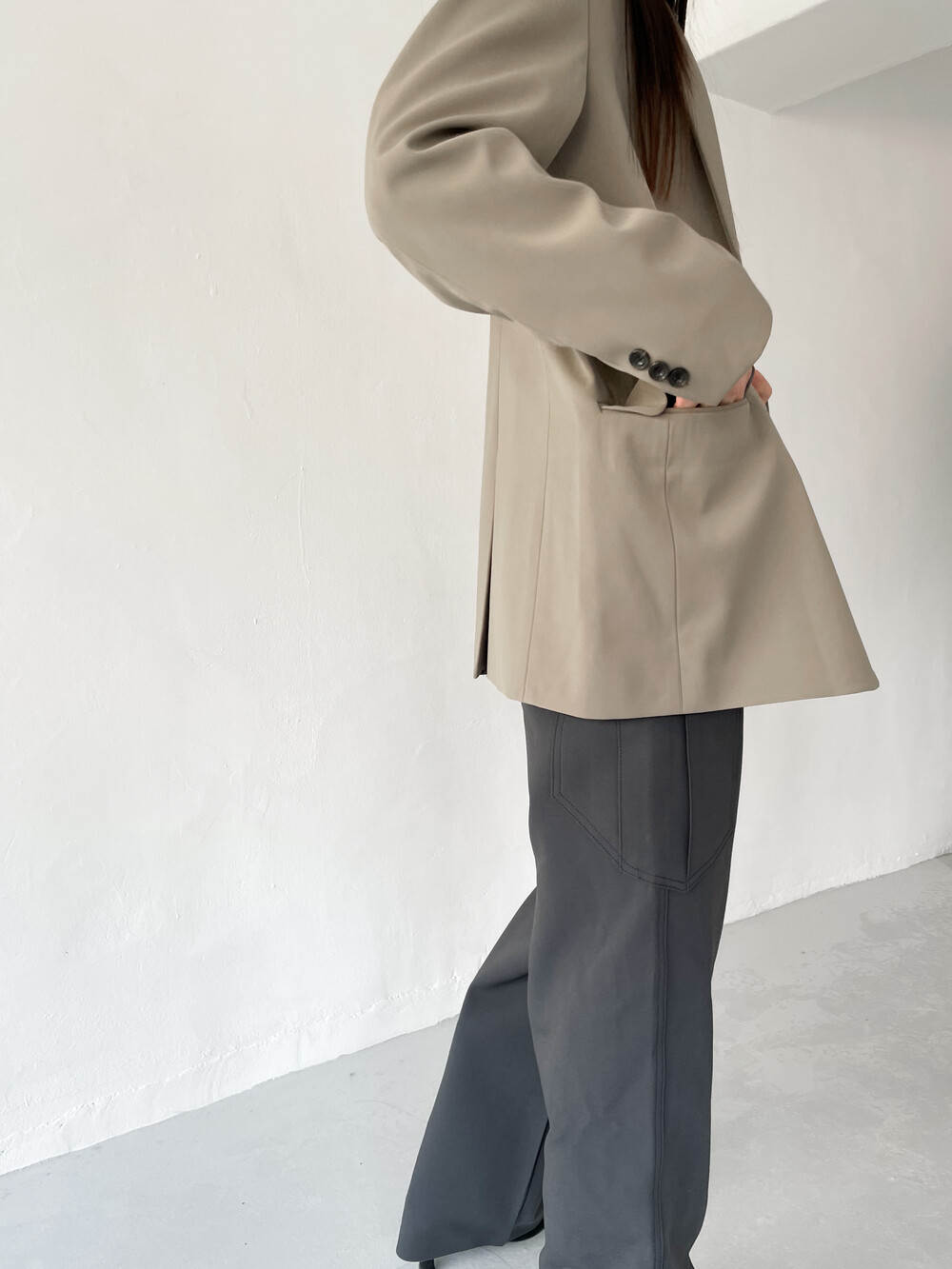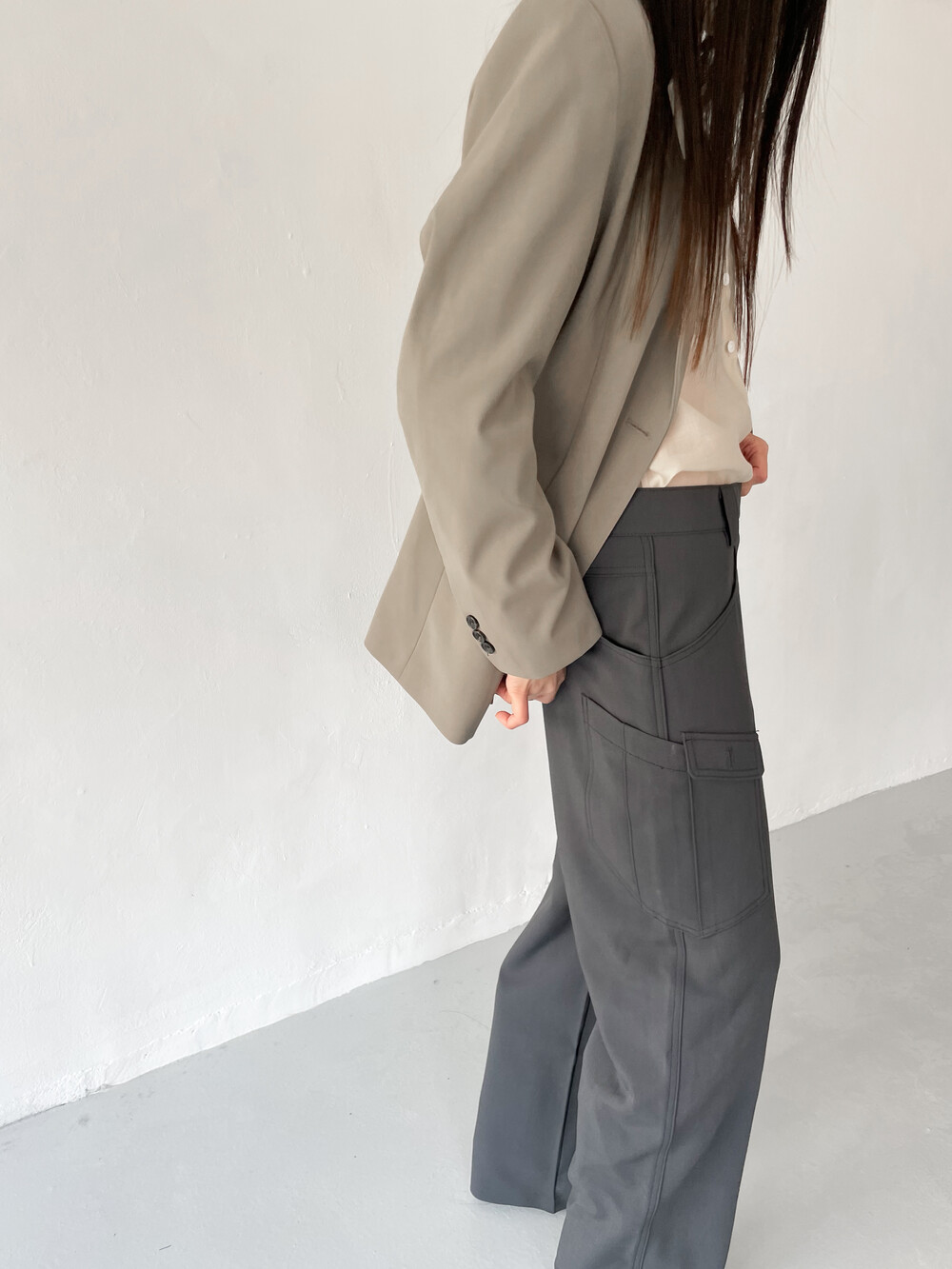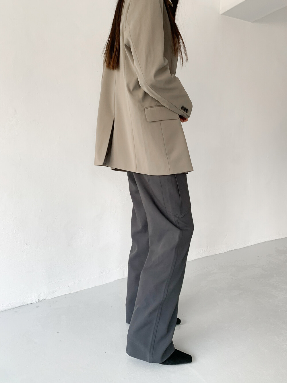 적당히 툭 떨어지는 와이드한 핏으로 레그라인이 길게