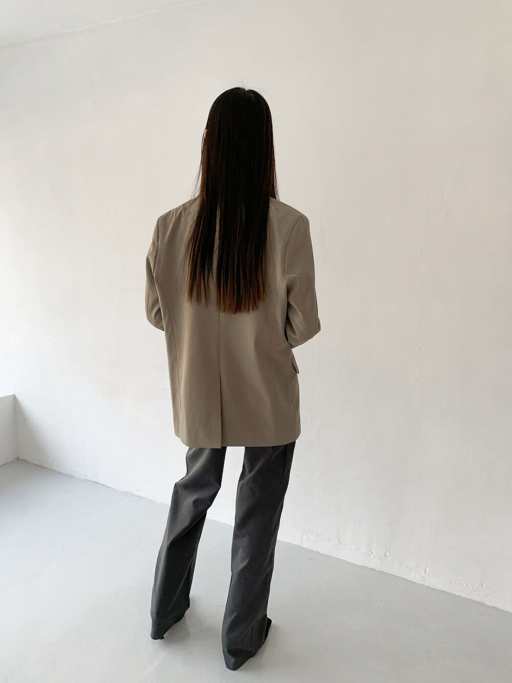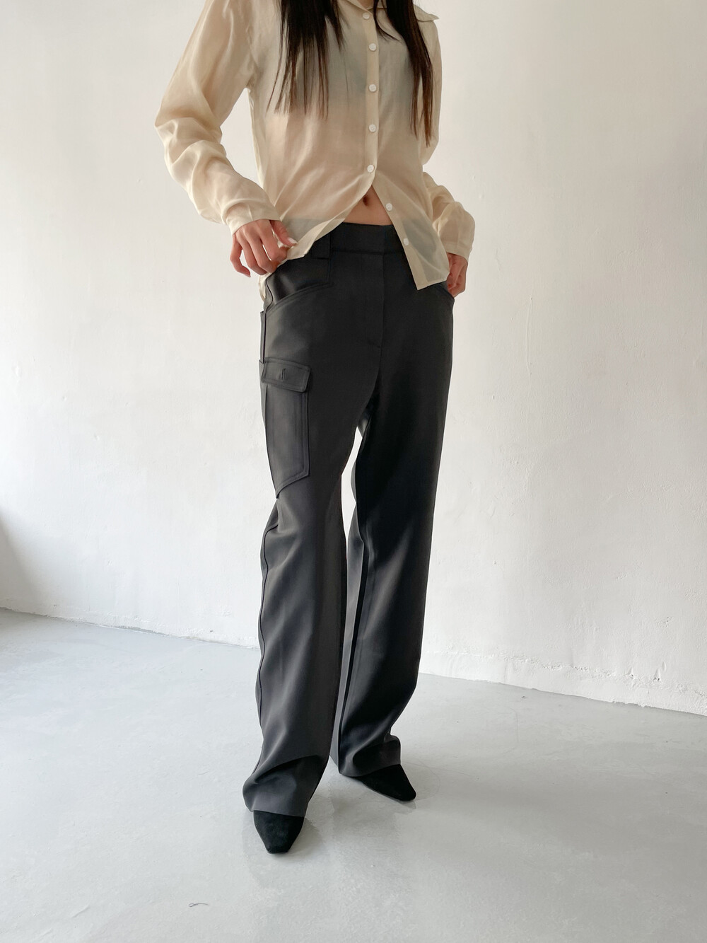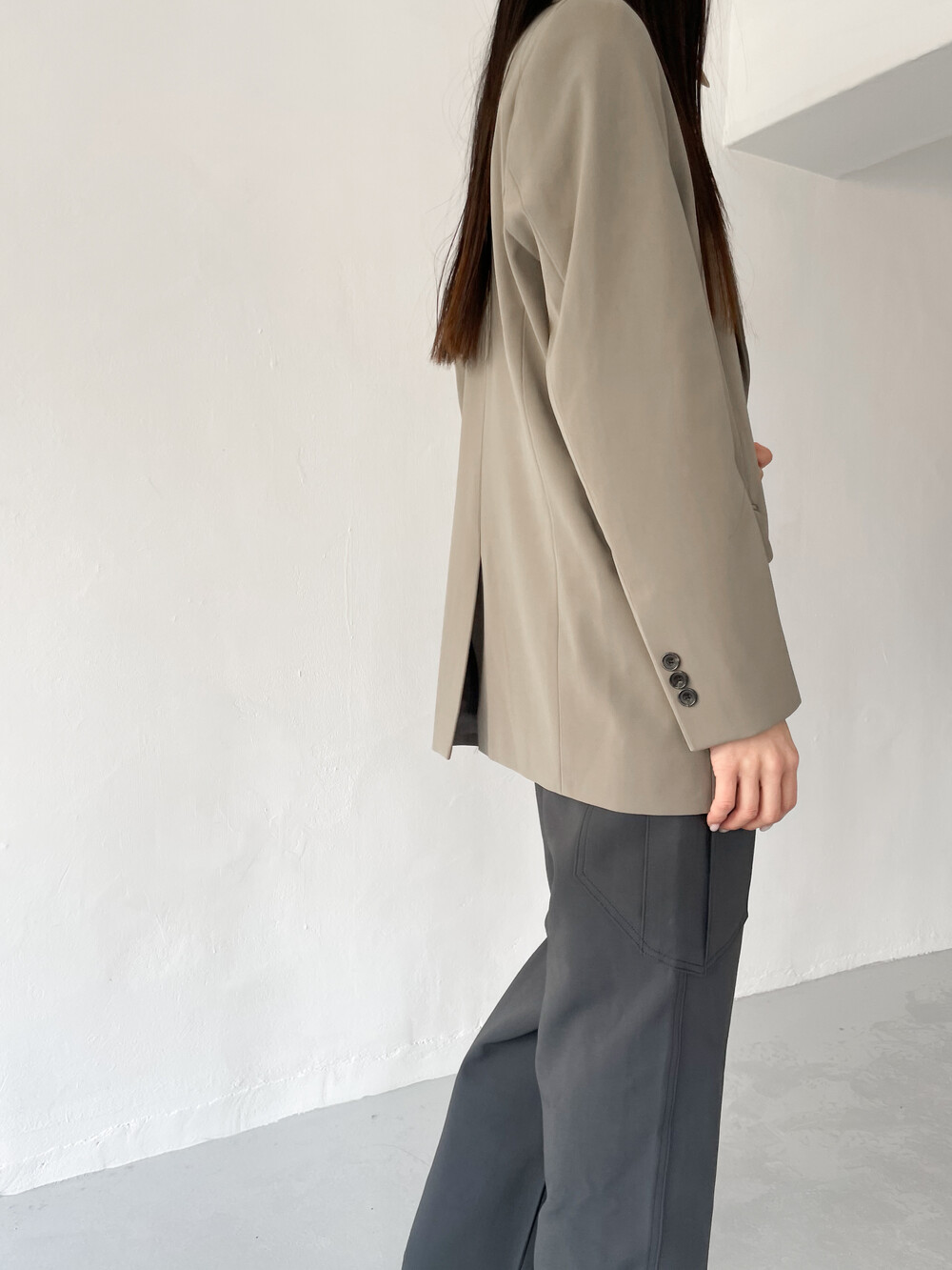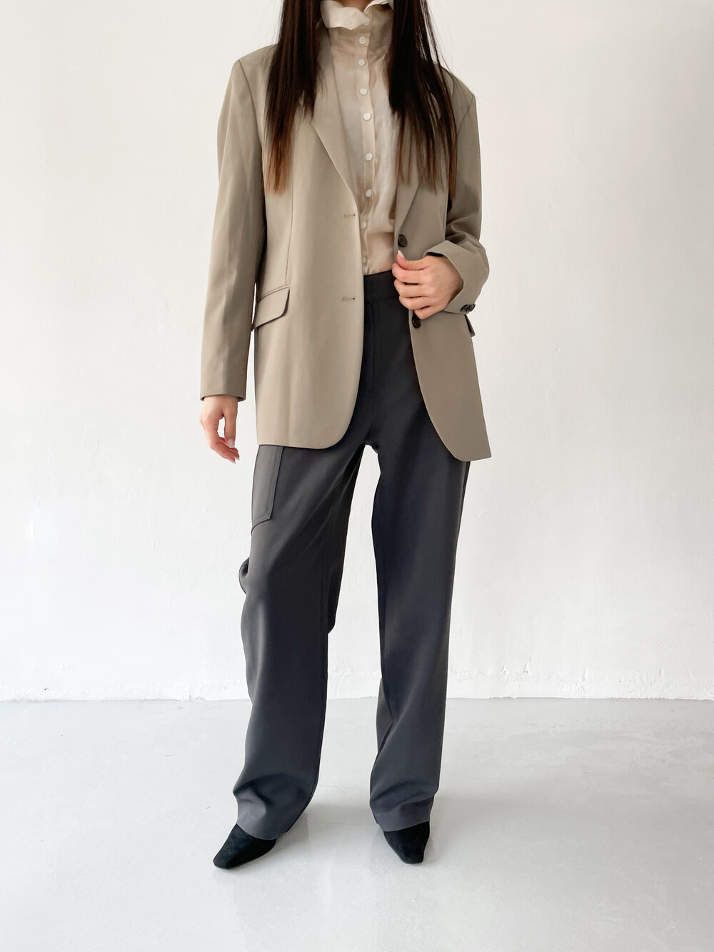 적당히 툭 떨어지는 와이드한 핏으로 레그라인이 길게