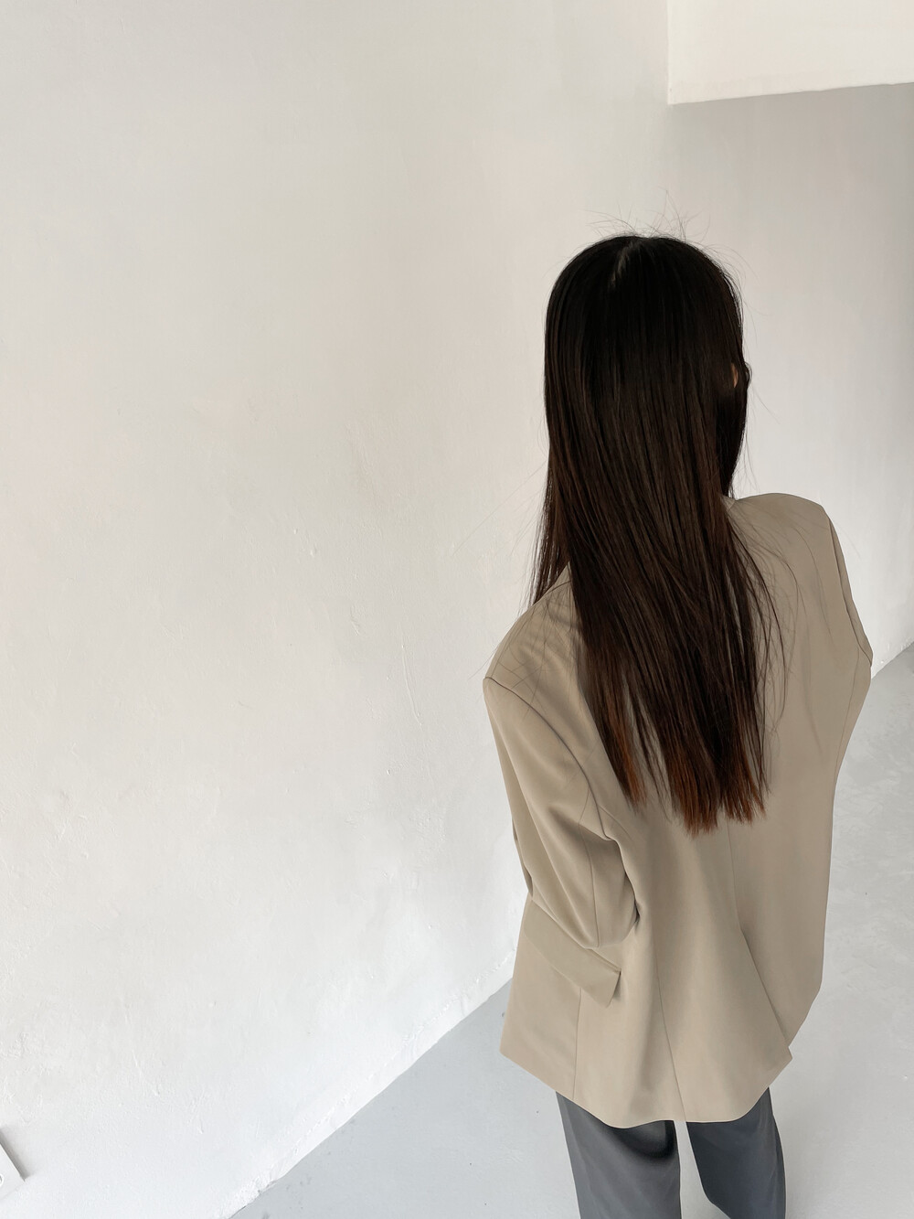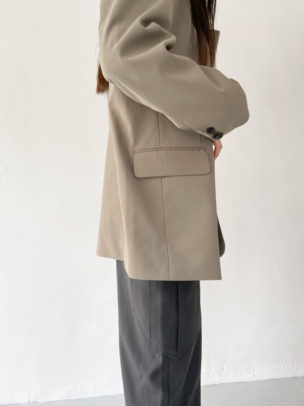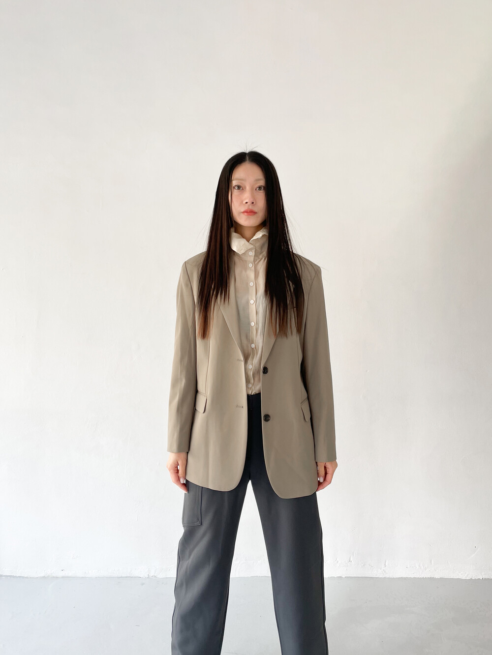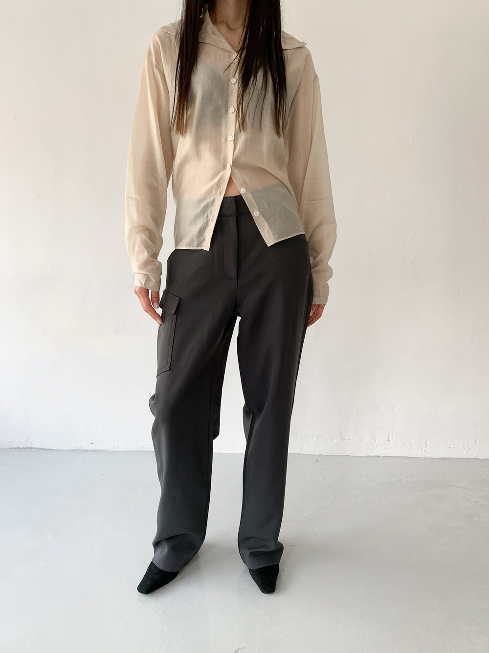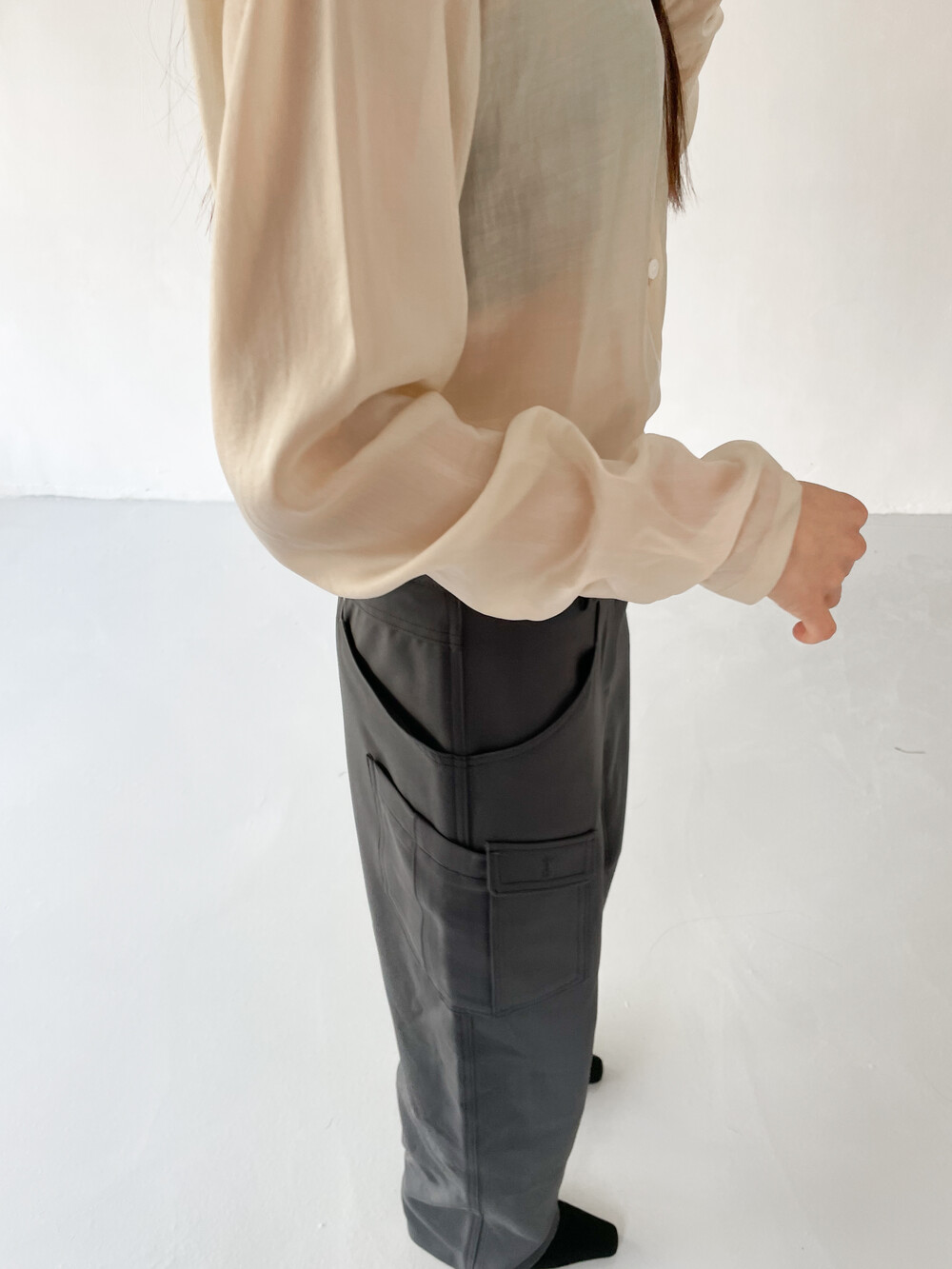 적당히 툭 떨어지는 와이드한 핏으로 레그라인이 길게