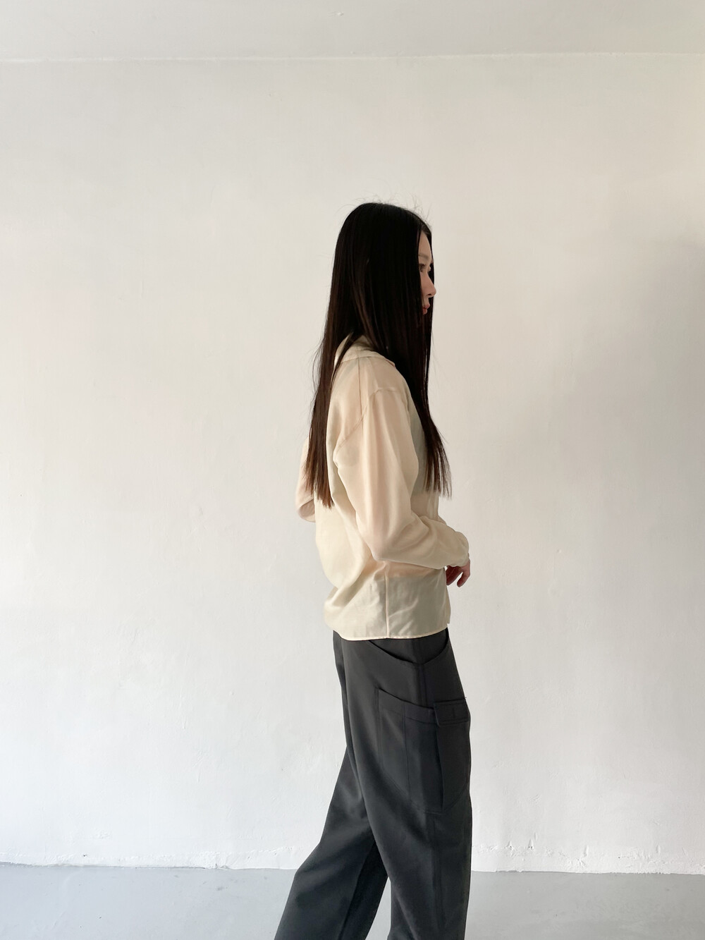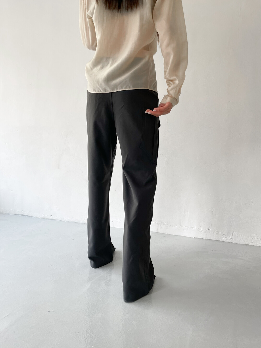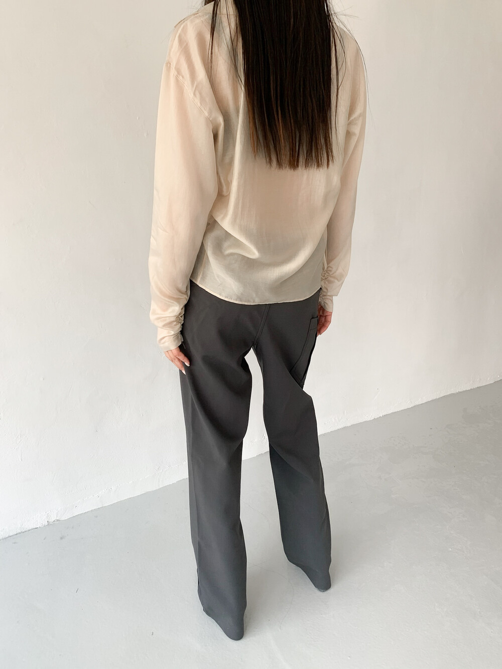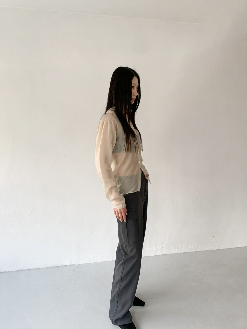 적당히 툭 떨어지는 와이드한 핏으로 레그라인이 길게