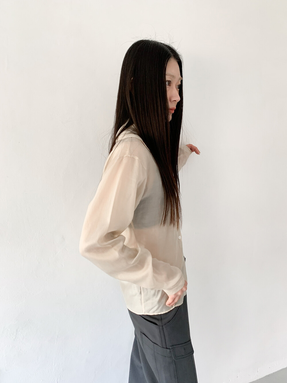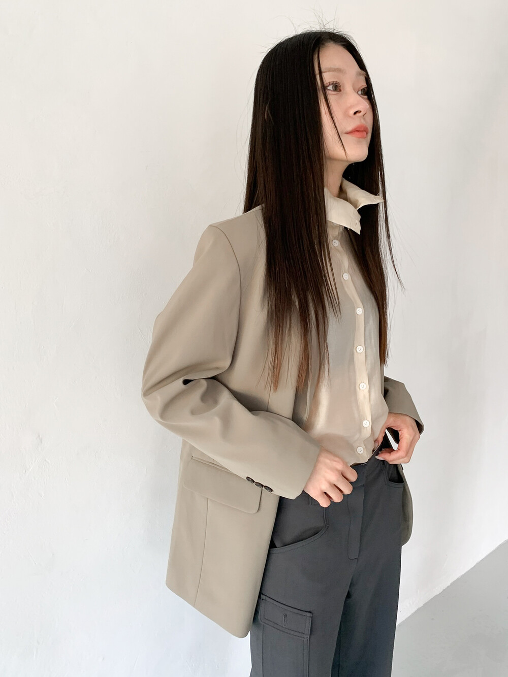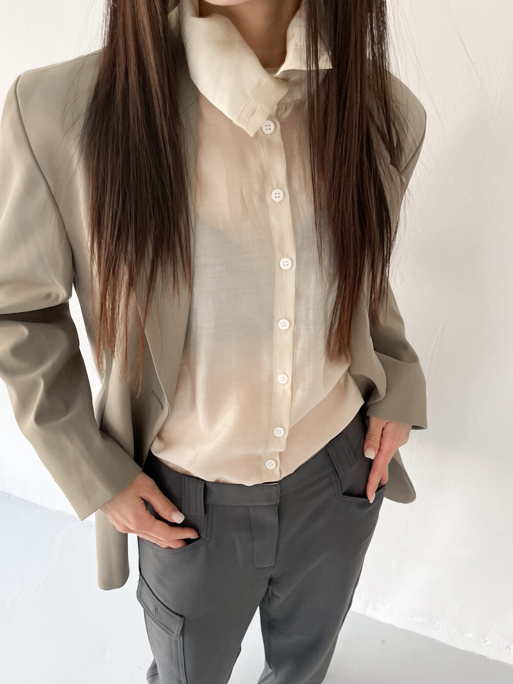 얇게 합포를 해서 실루엣이 딱 떨어지며 스판기가 있는 원단이라