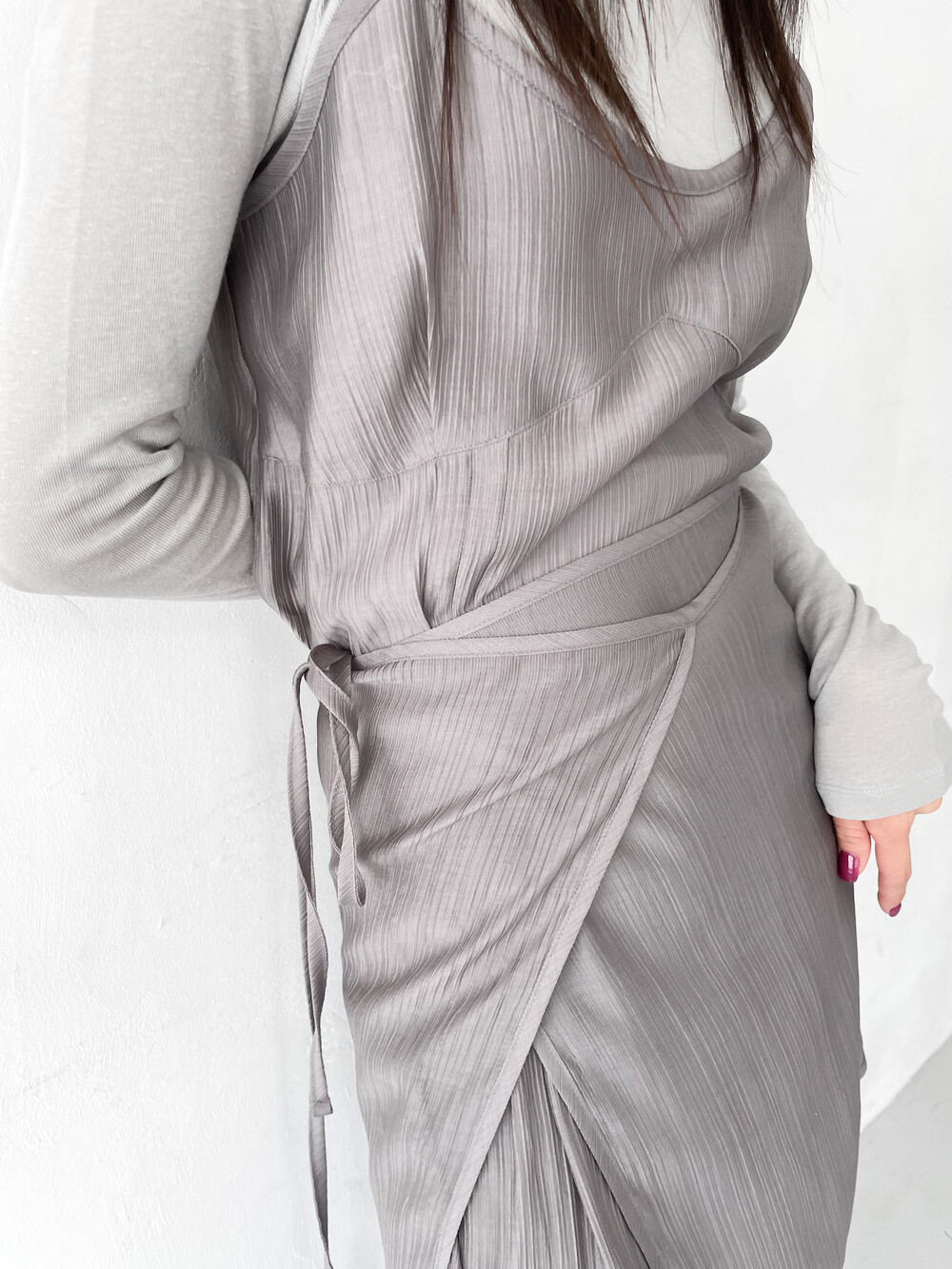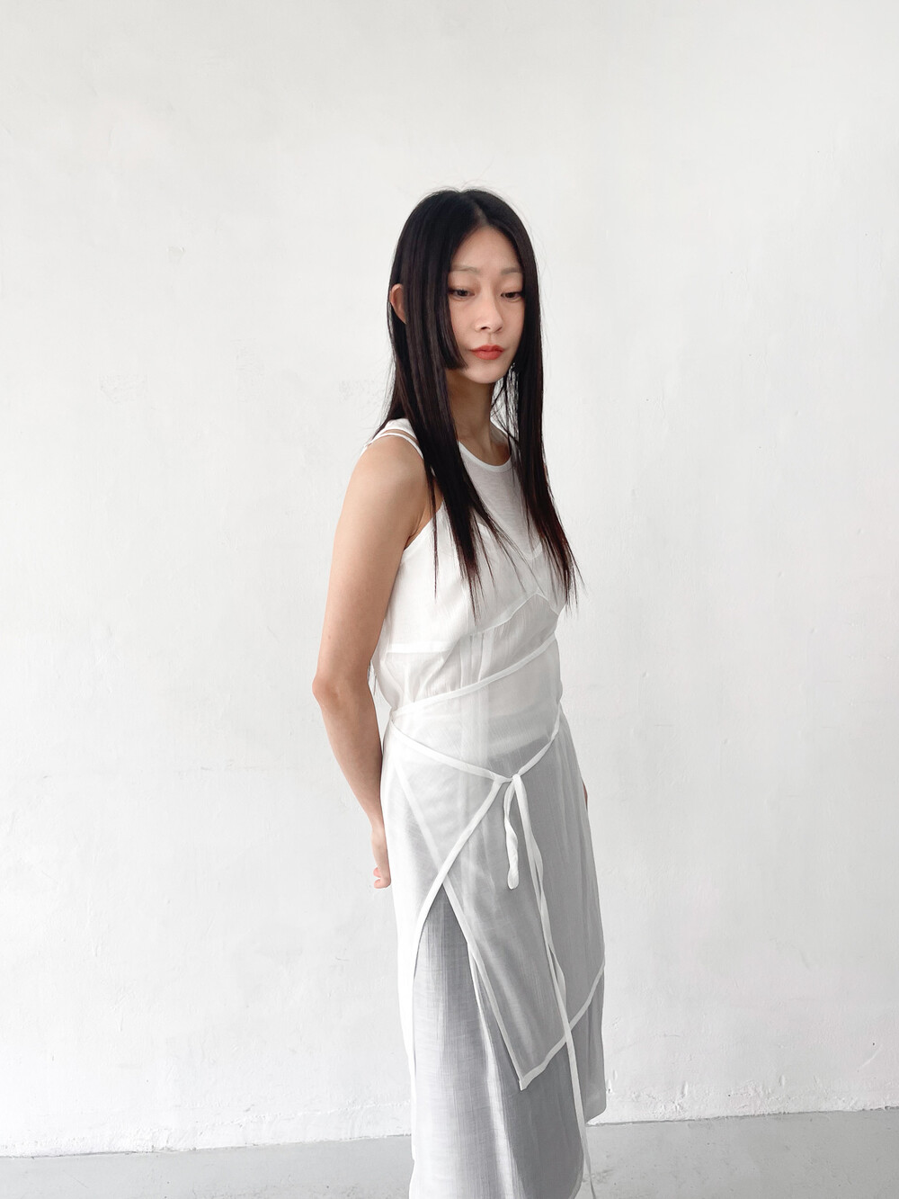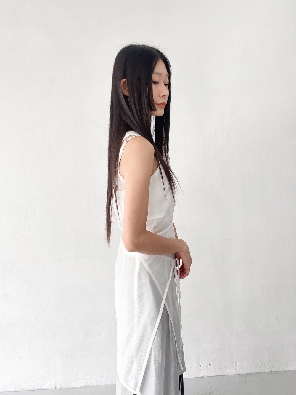 여유로운 기장감과 넉넉한 품의 원피스에 랩을 두르면