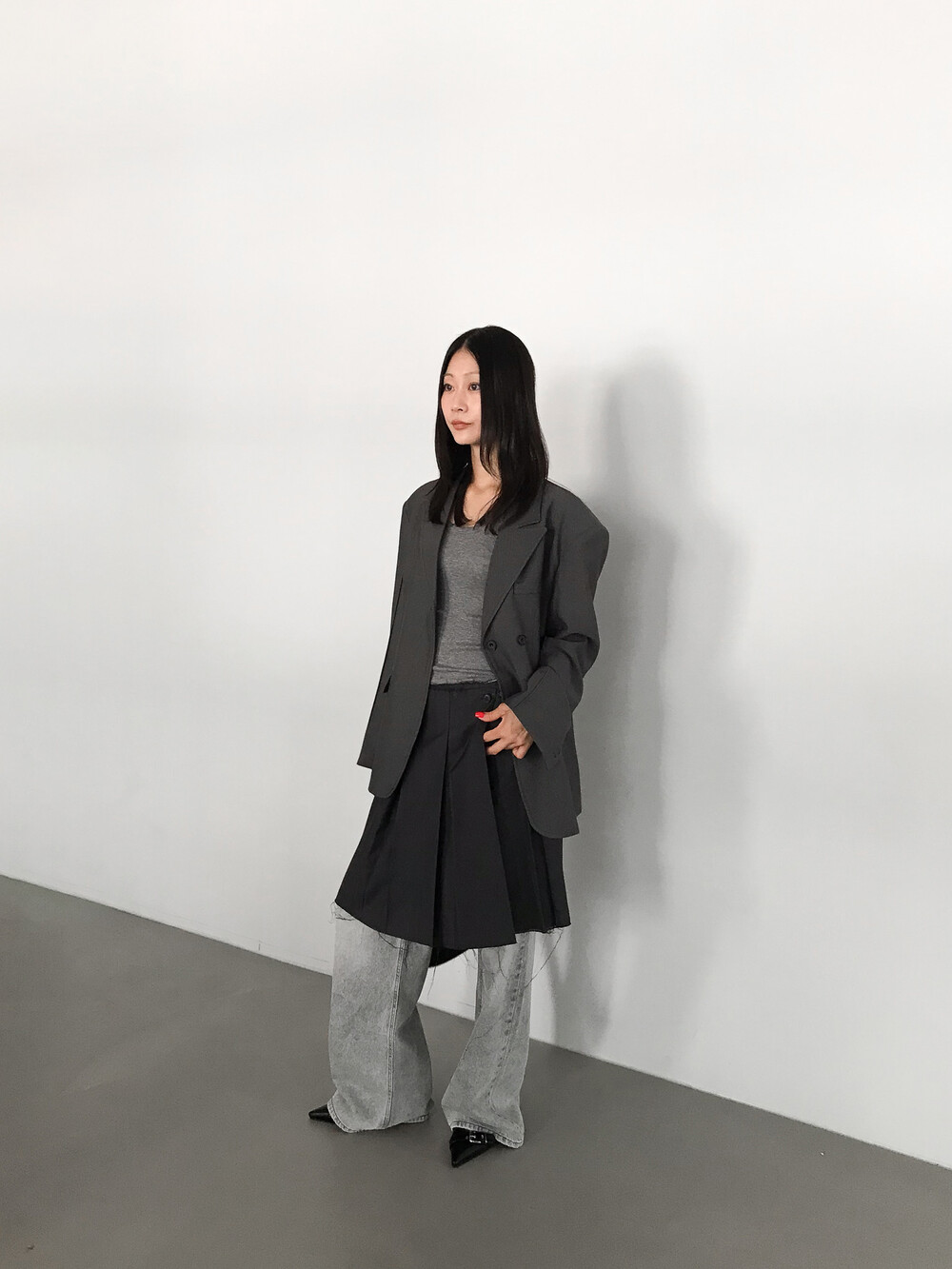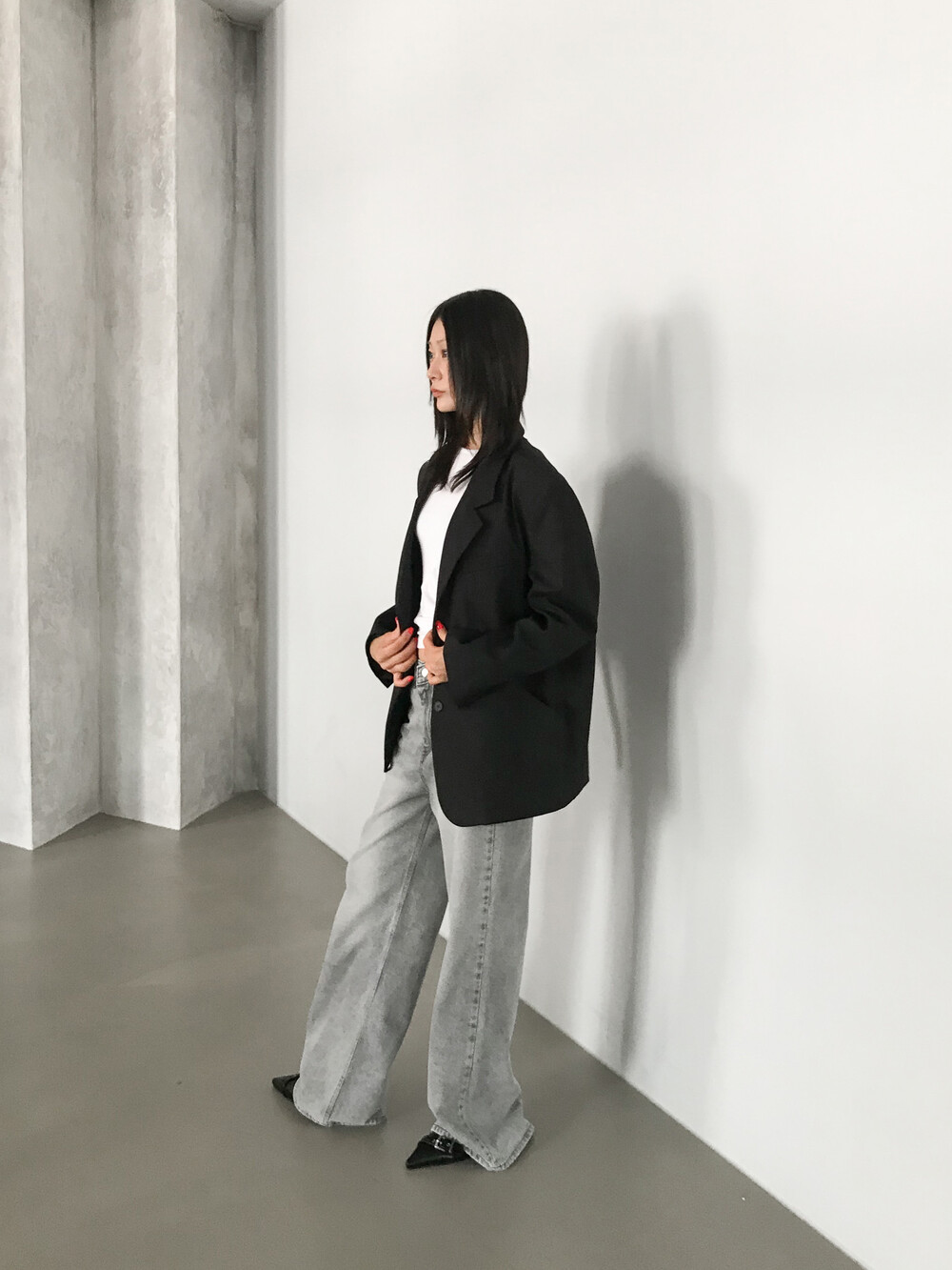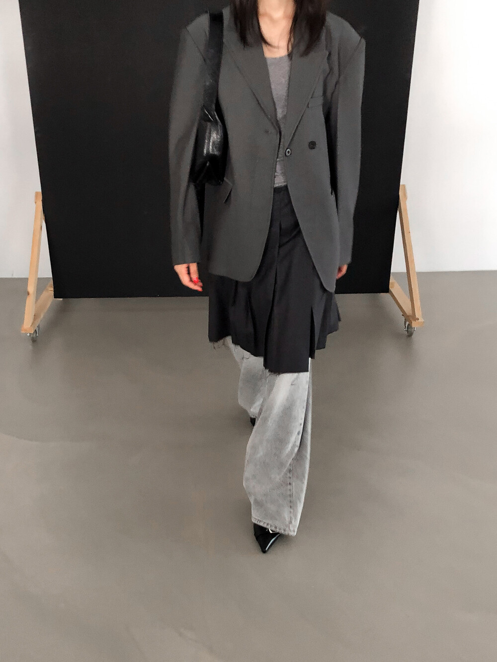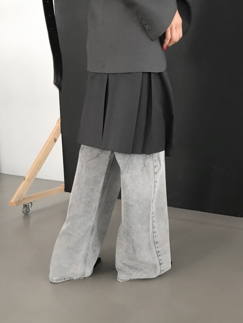 와이드한 실루엣과 발등에 루즈하게 쌓이는 기장감