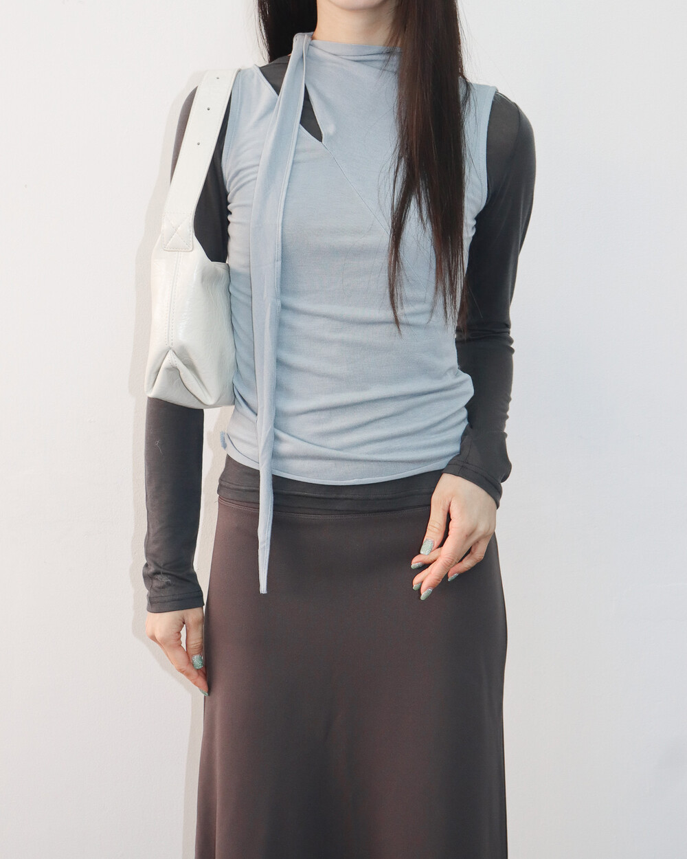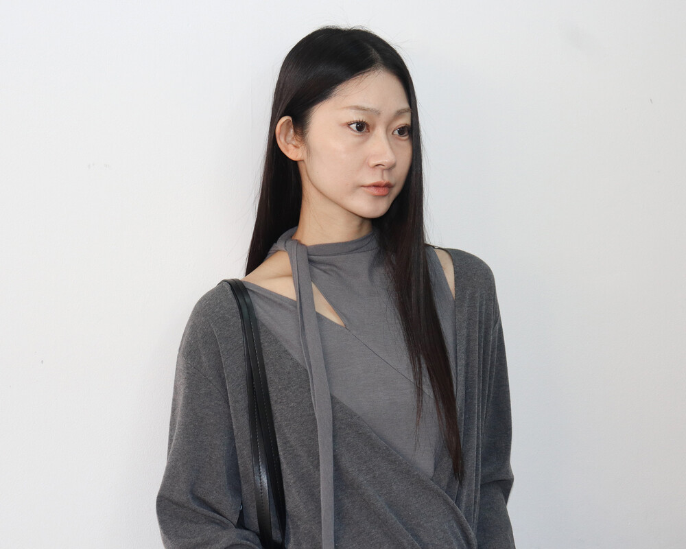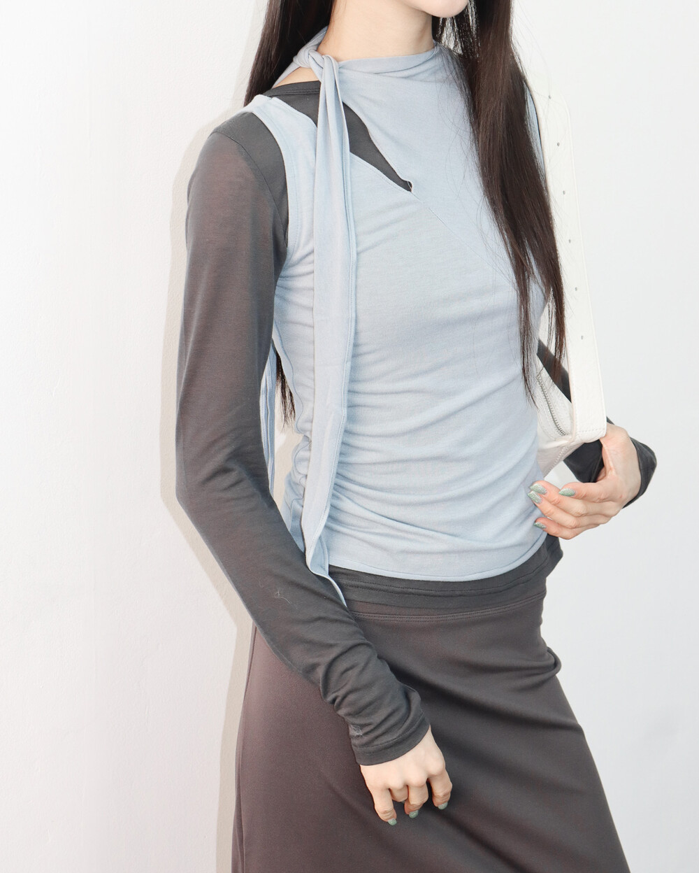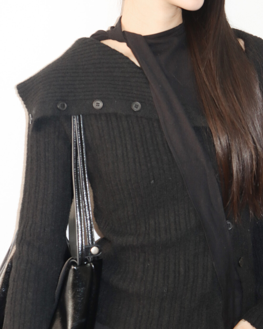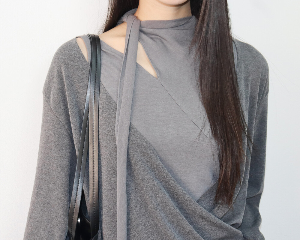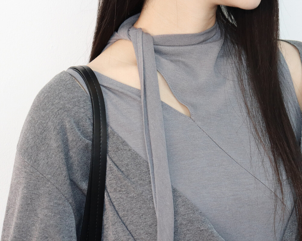 스카프 트임 사이로 쇄골 라인이 은은하게 드러나