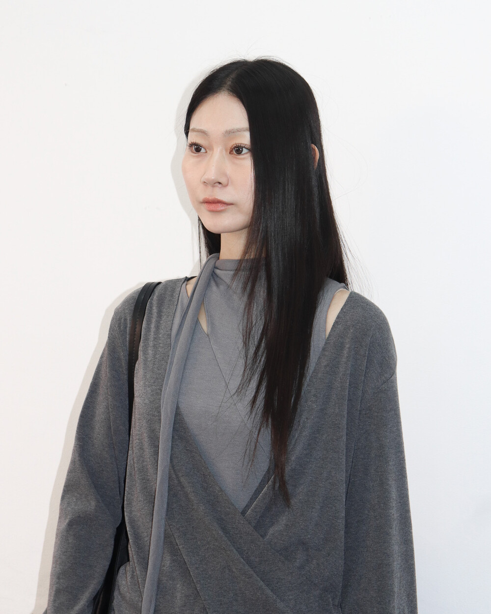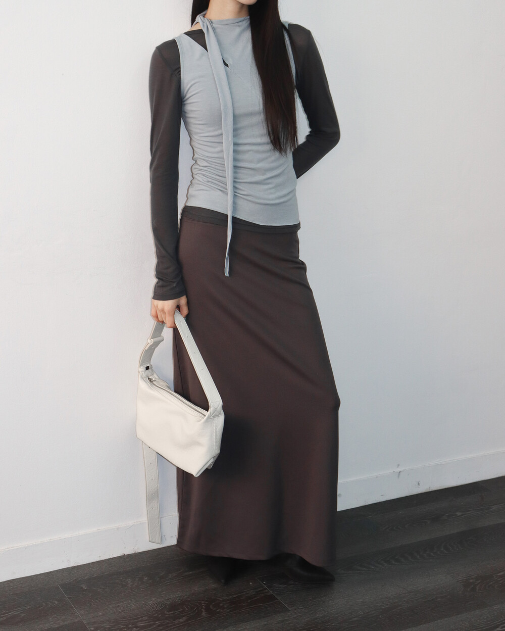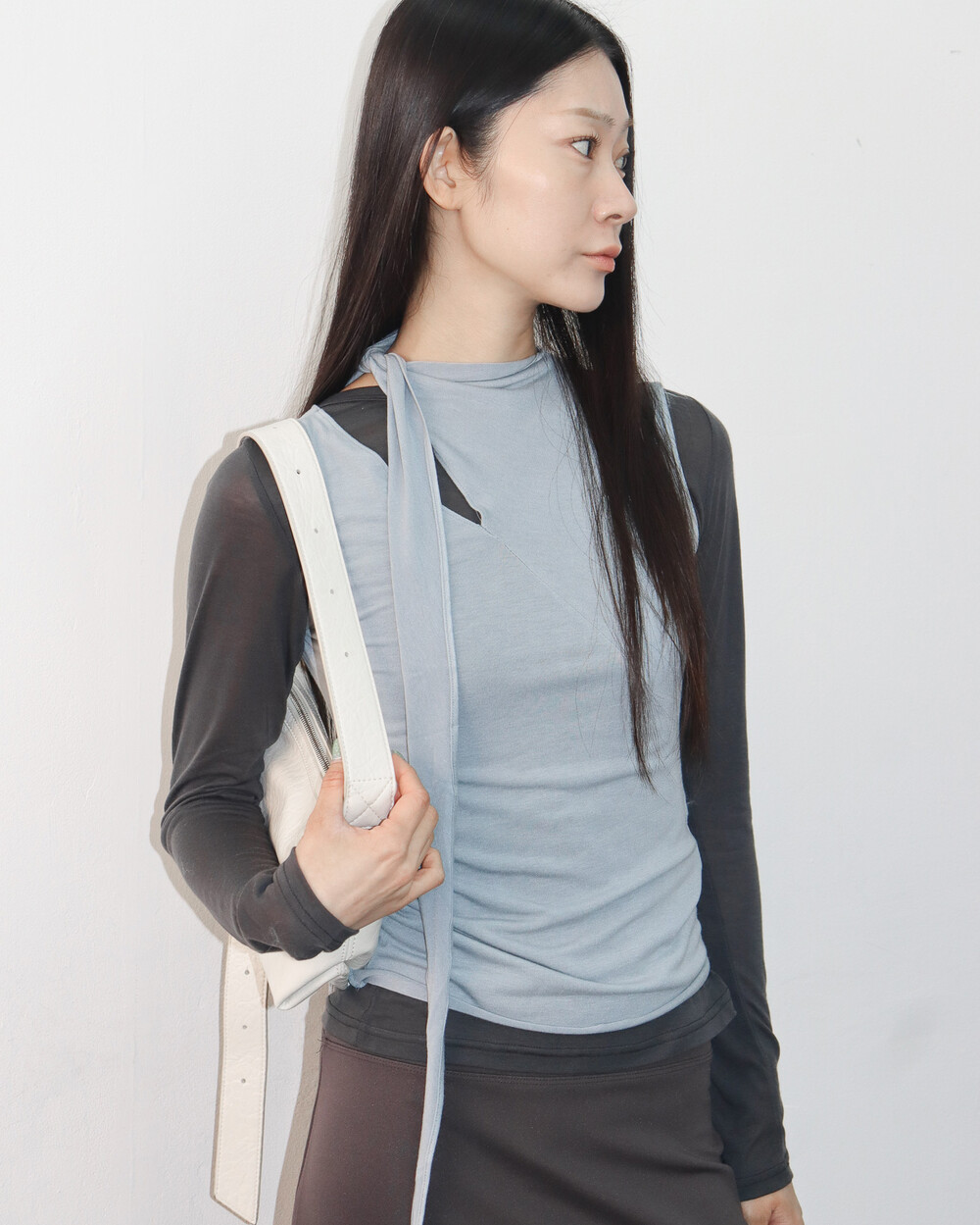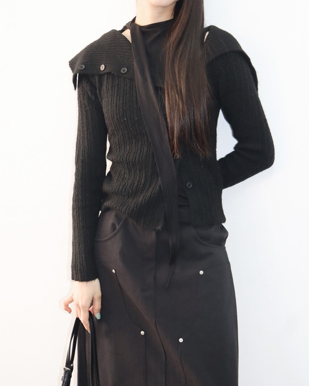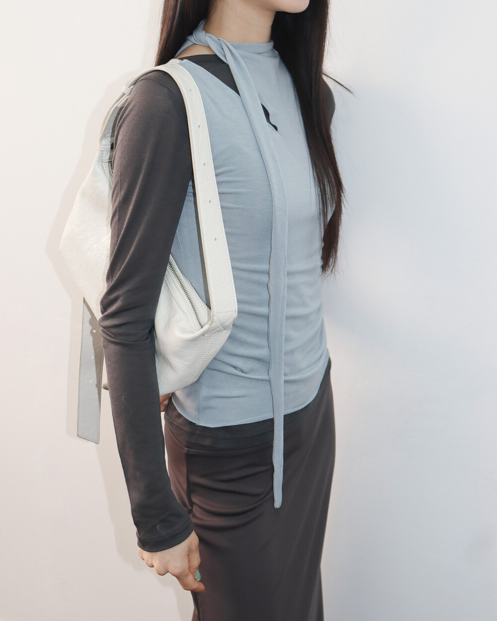 스카프 트임 사이로 쇄골 라인이 은은하게 드러나