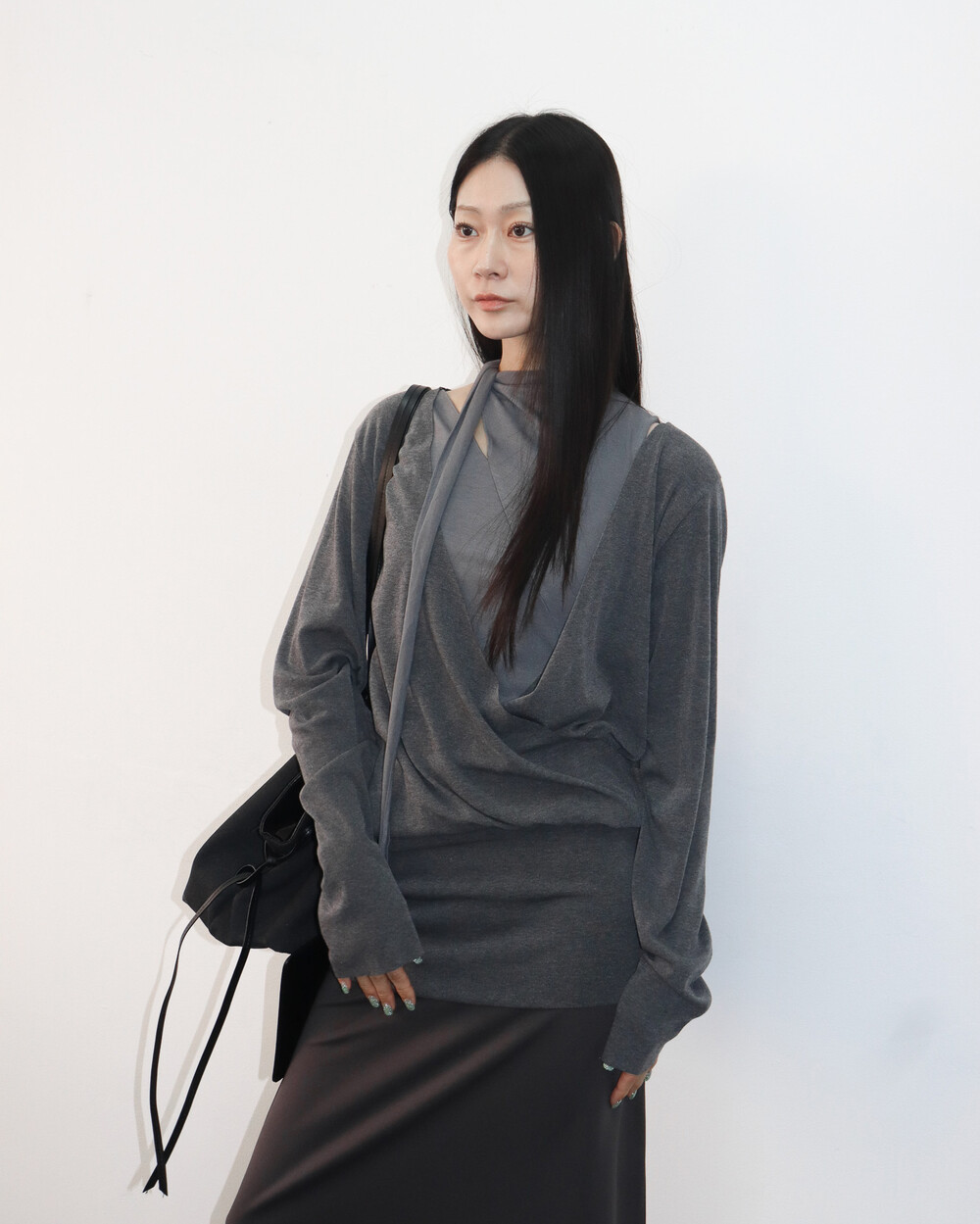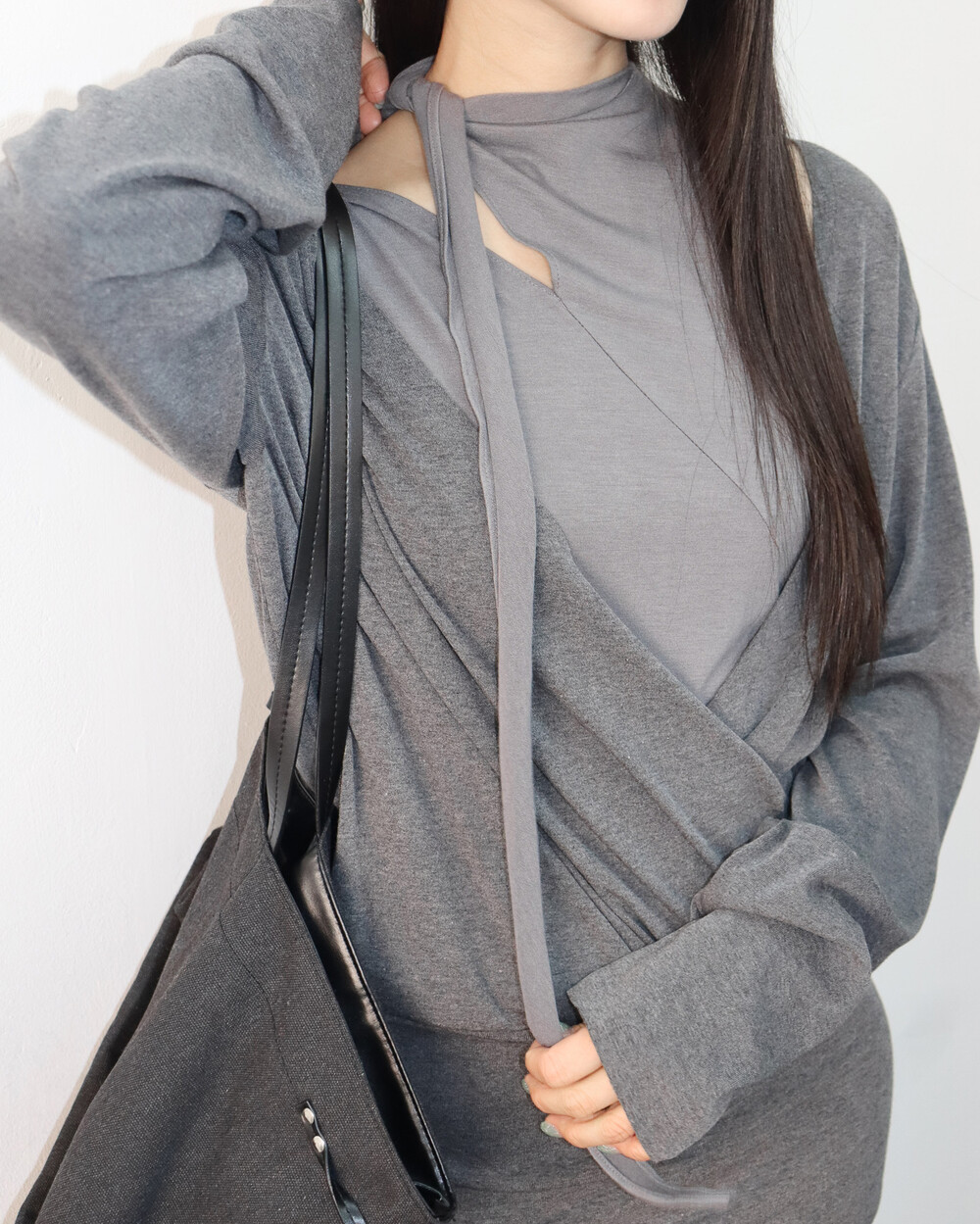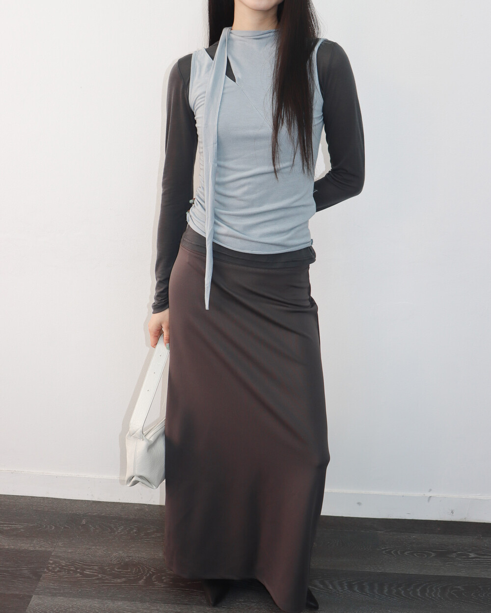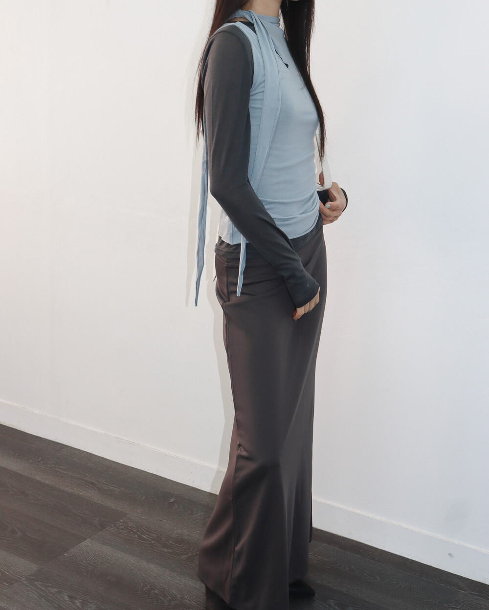 스카프 트임 사이로 쇄골 라인이 은은하게 드러나