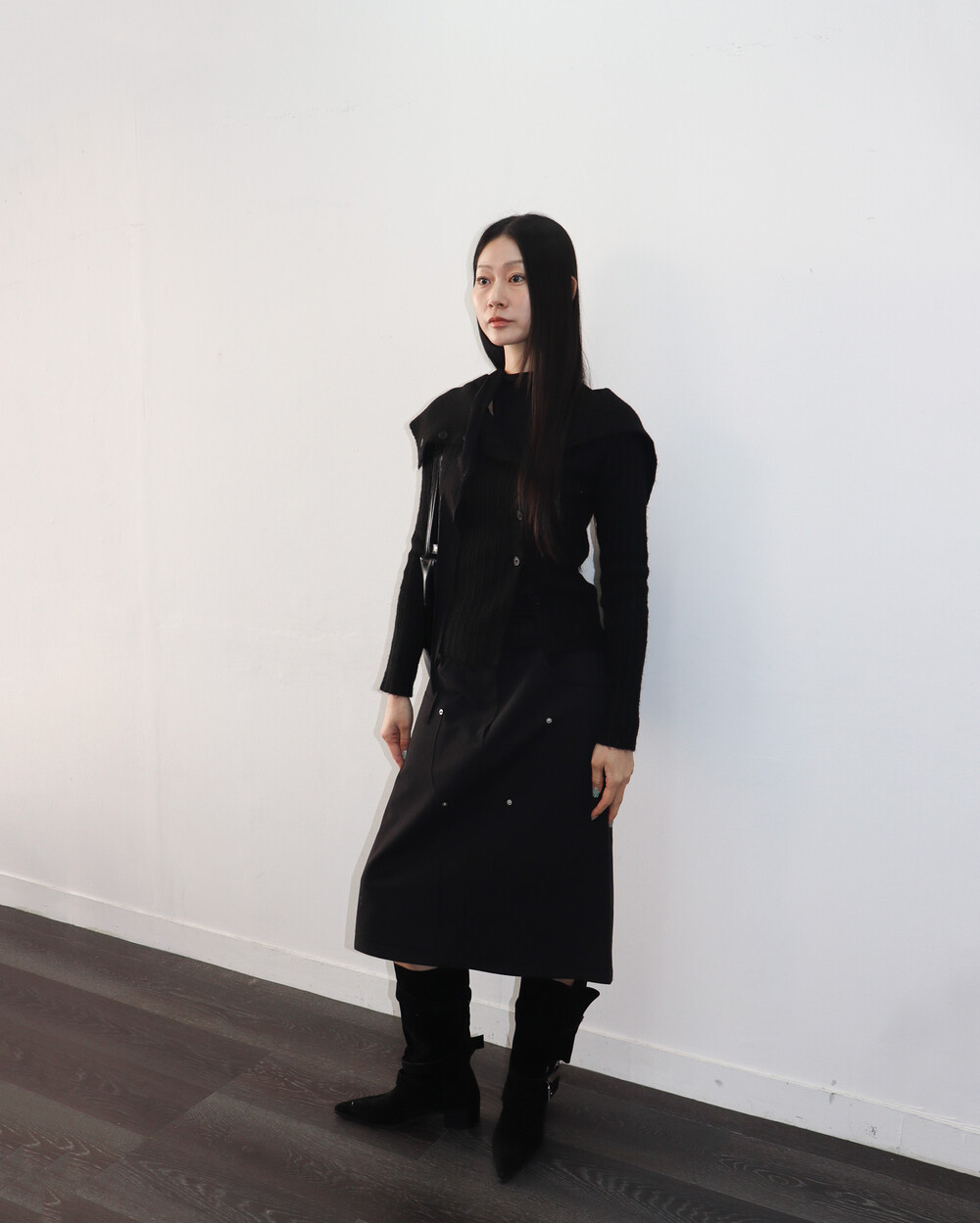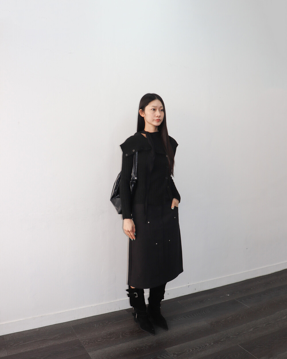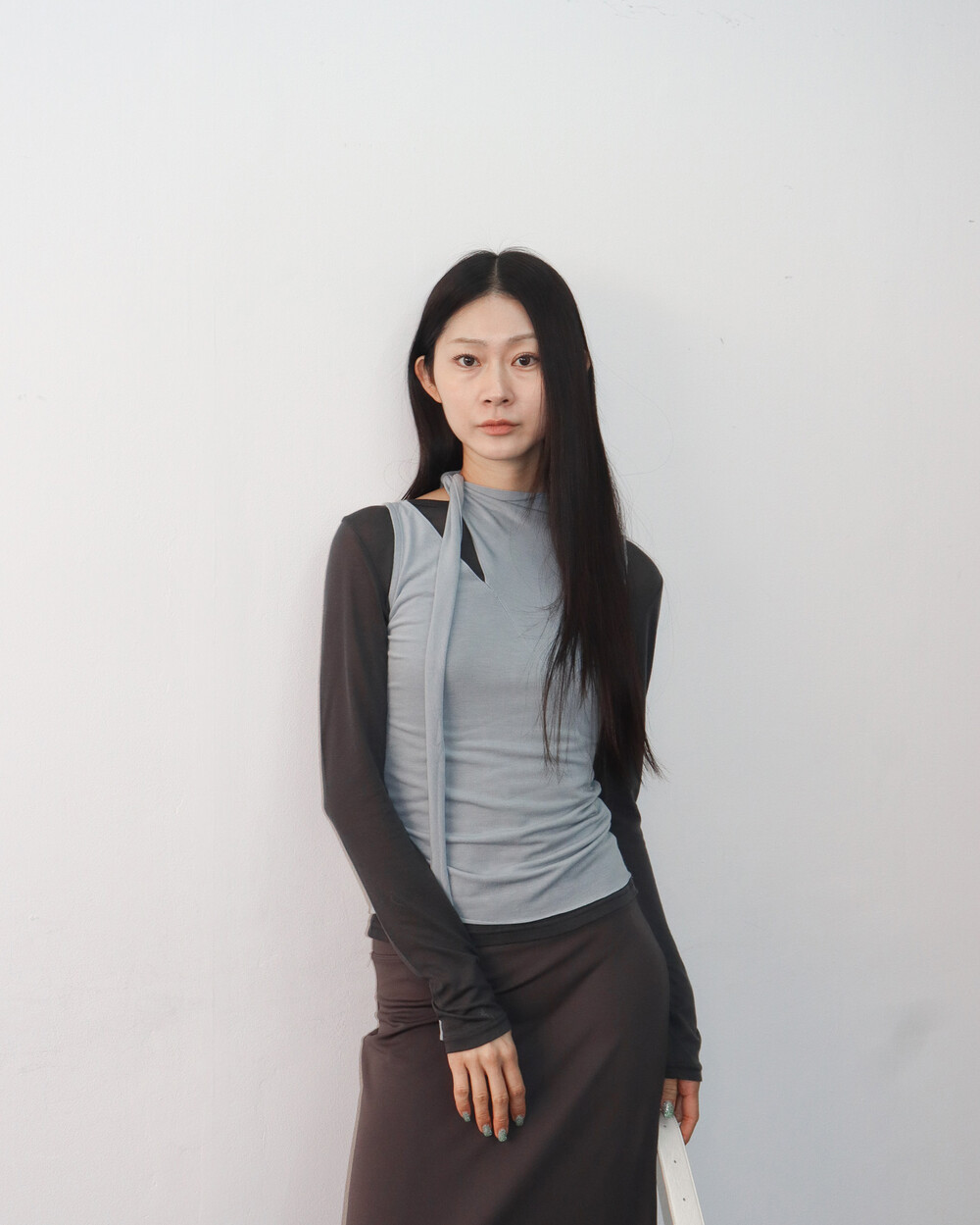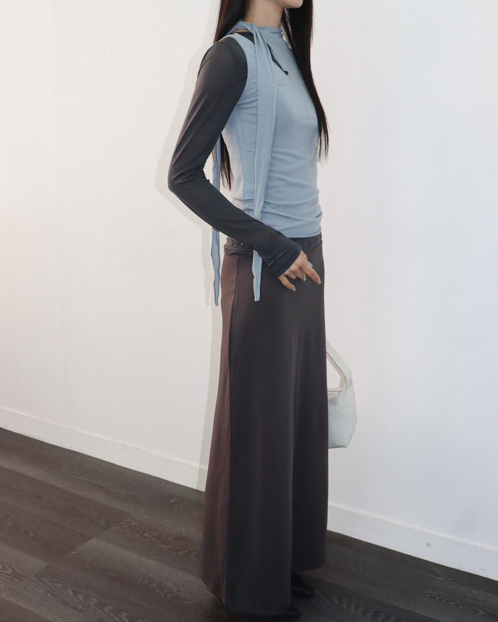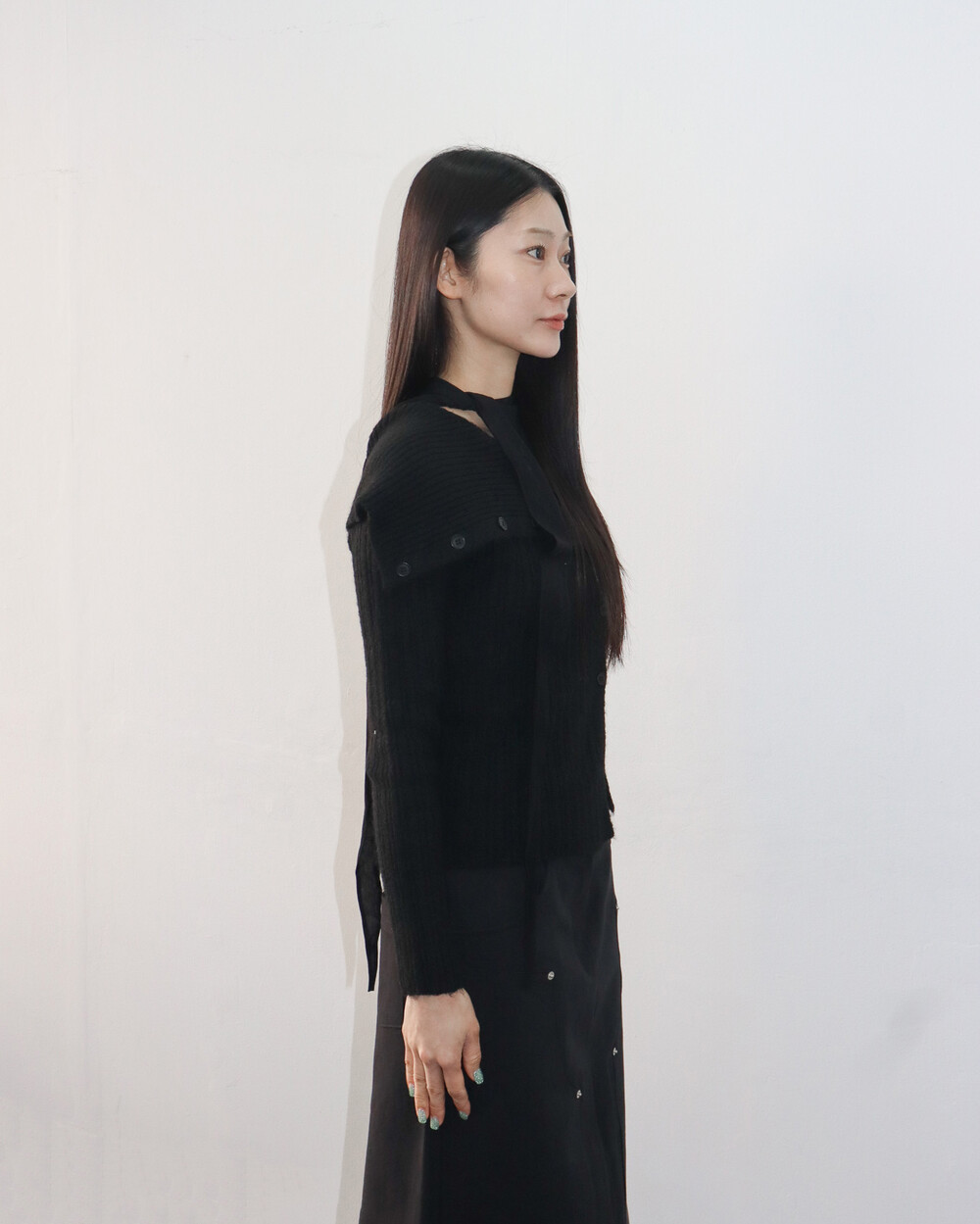 스카프 트임 사이로 쇄골 라인이 은은하게 드러나