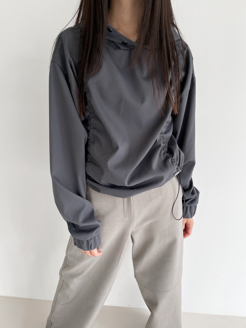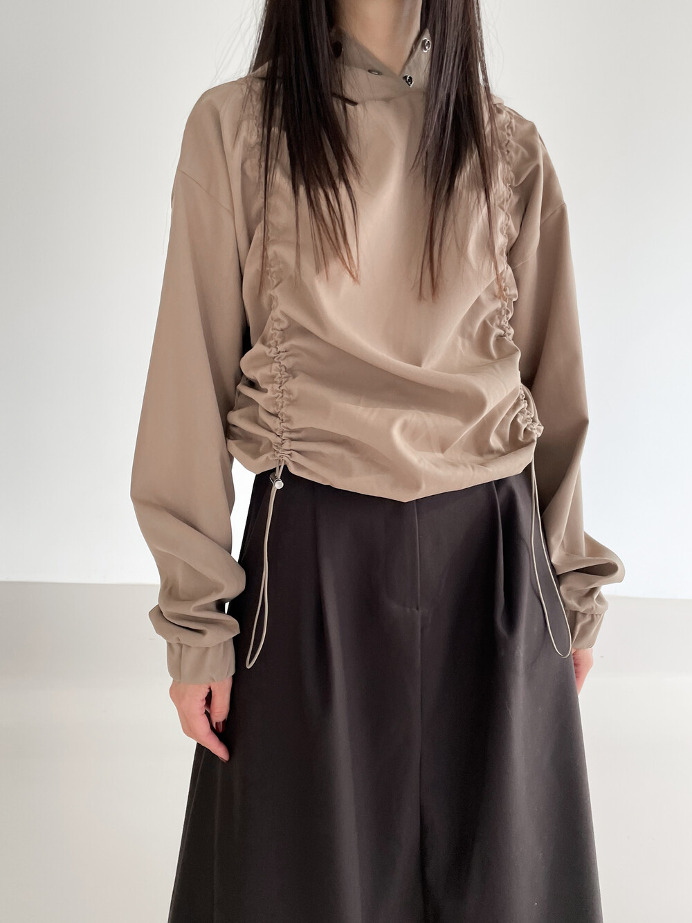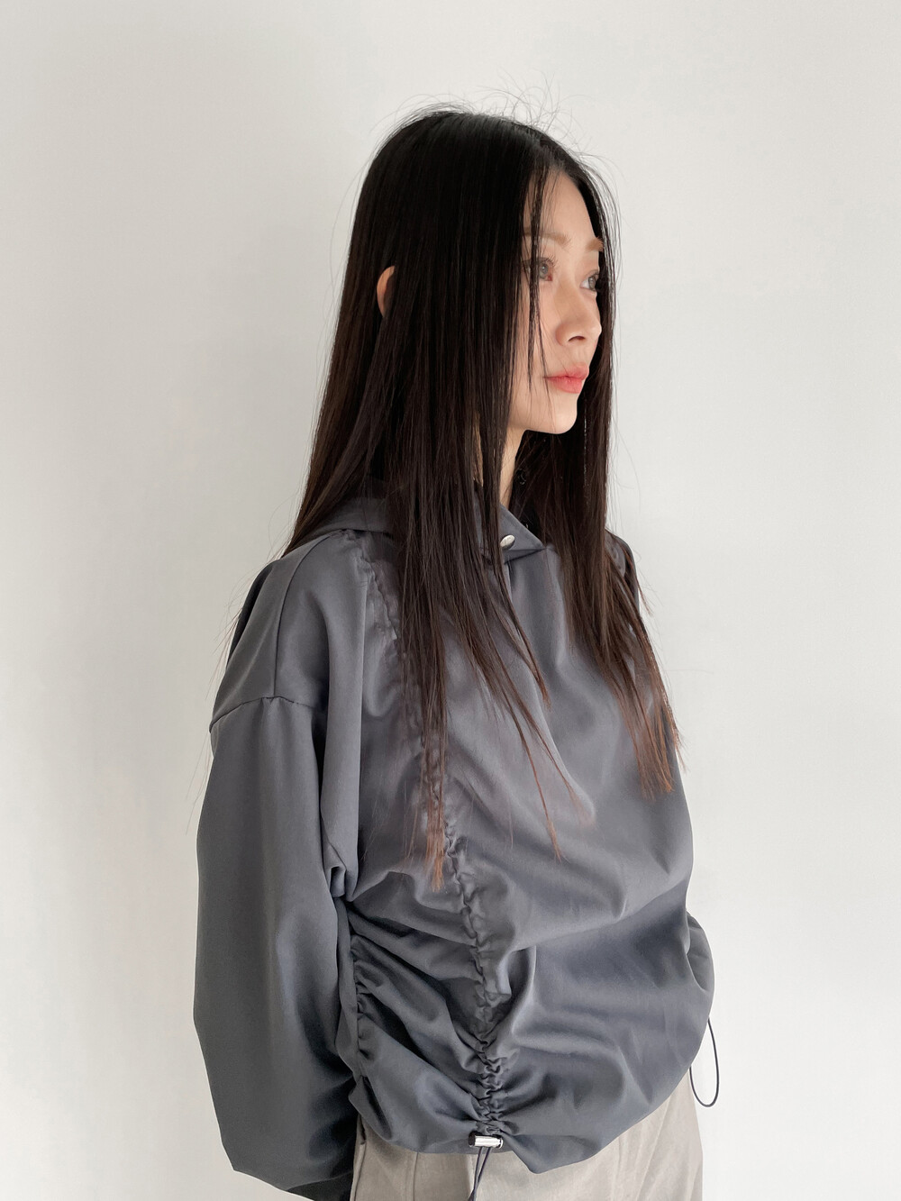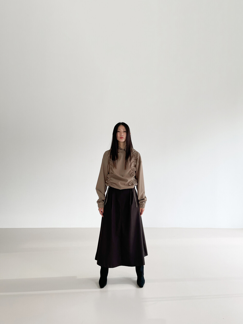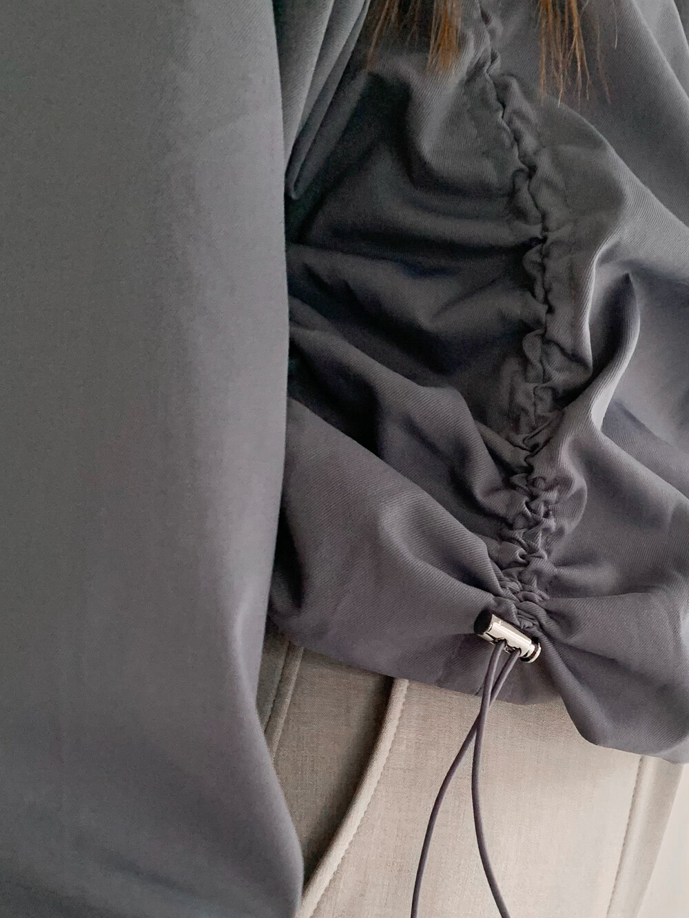 어깨라인부터 밑단까지 이어지는 셔링 디테일