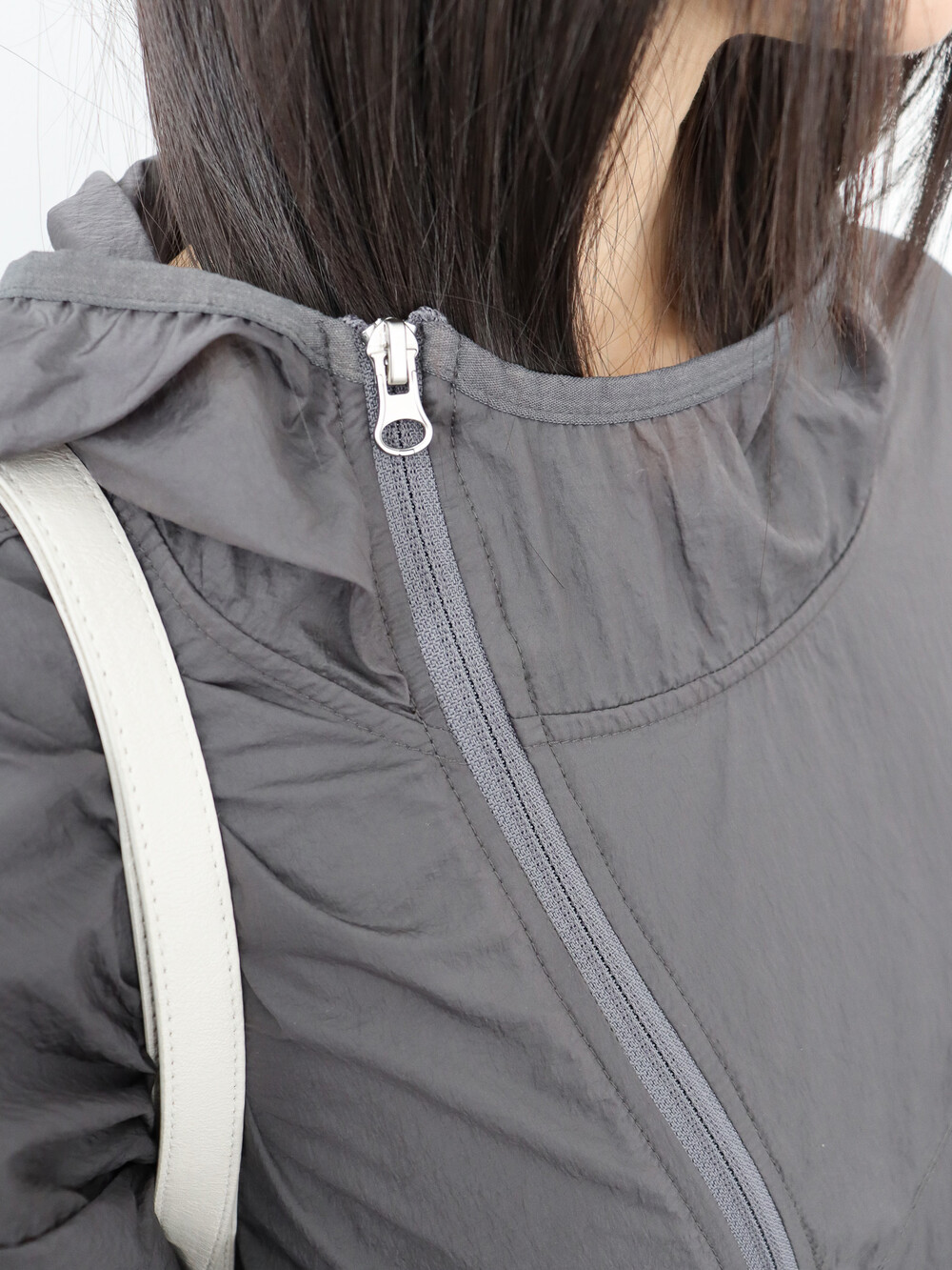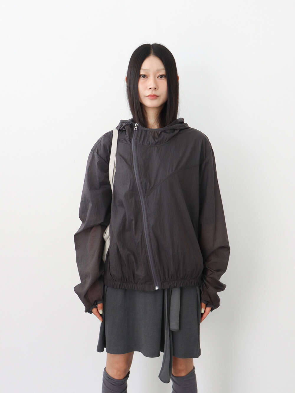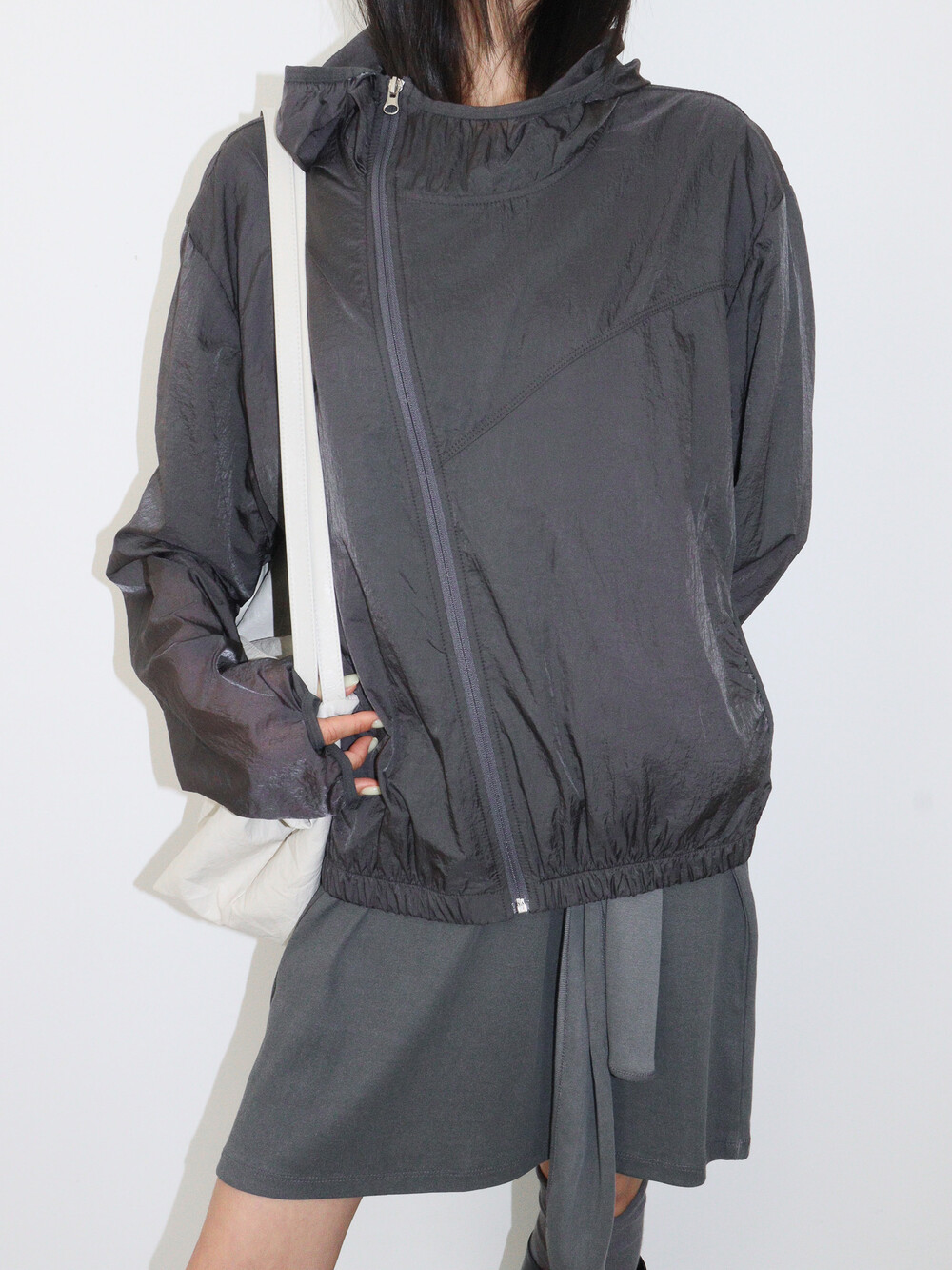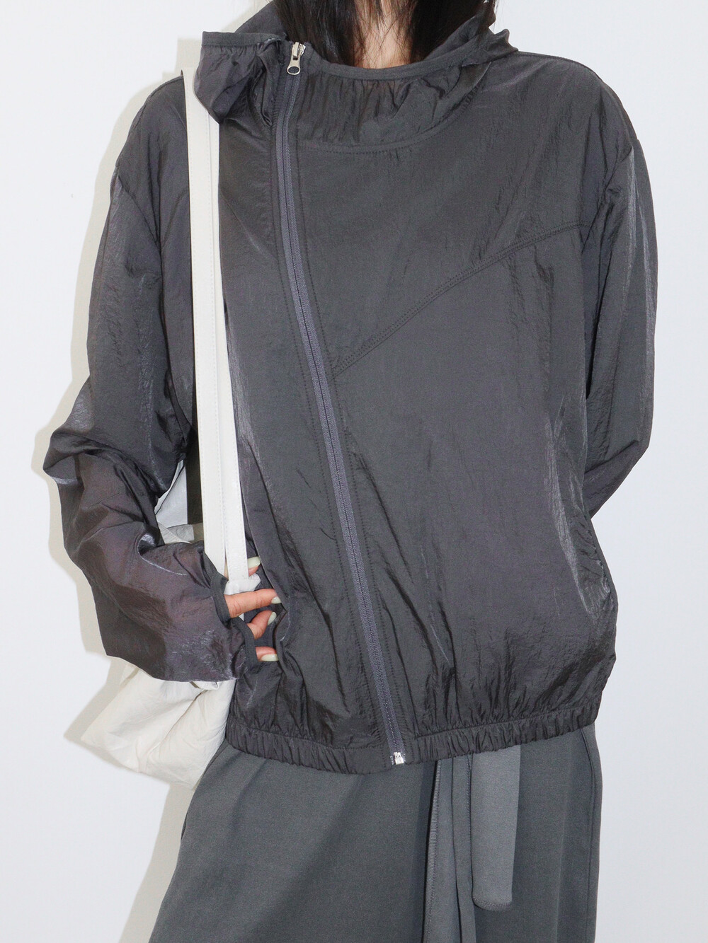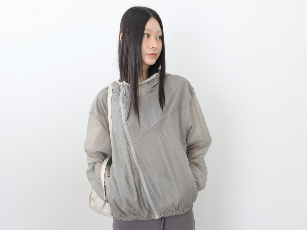 사선으로 떨어지는 절개 디테일이 돋보이는 유니크한 매력의 점퍼